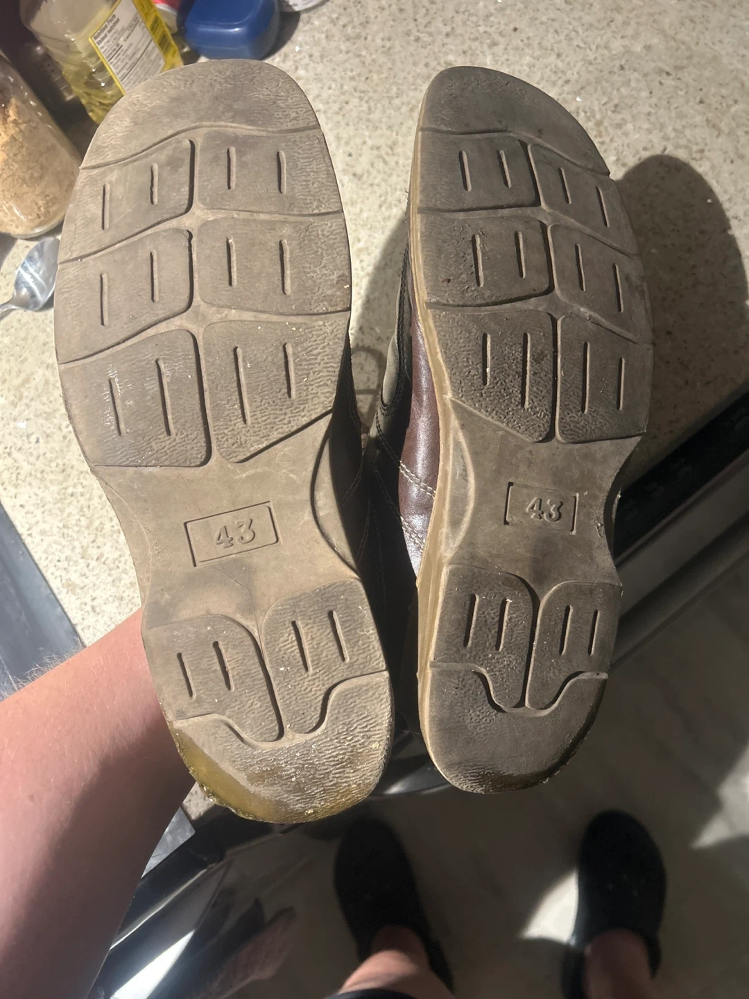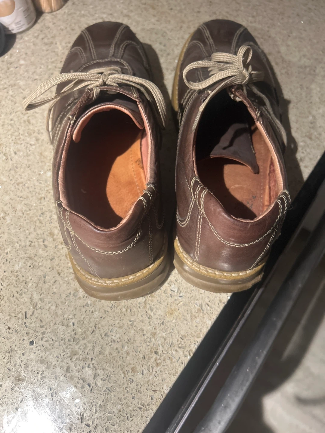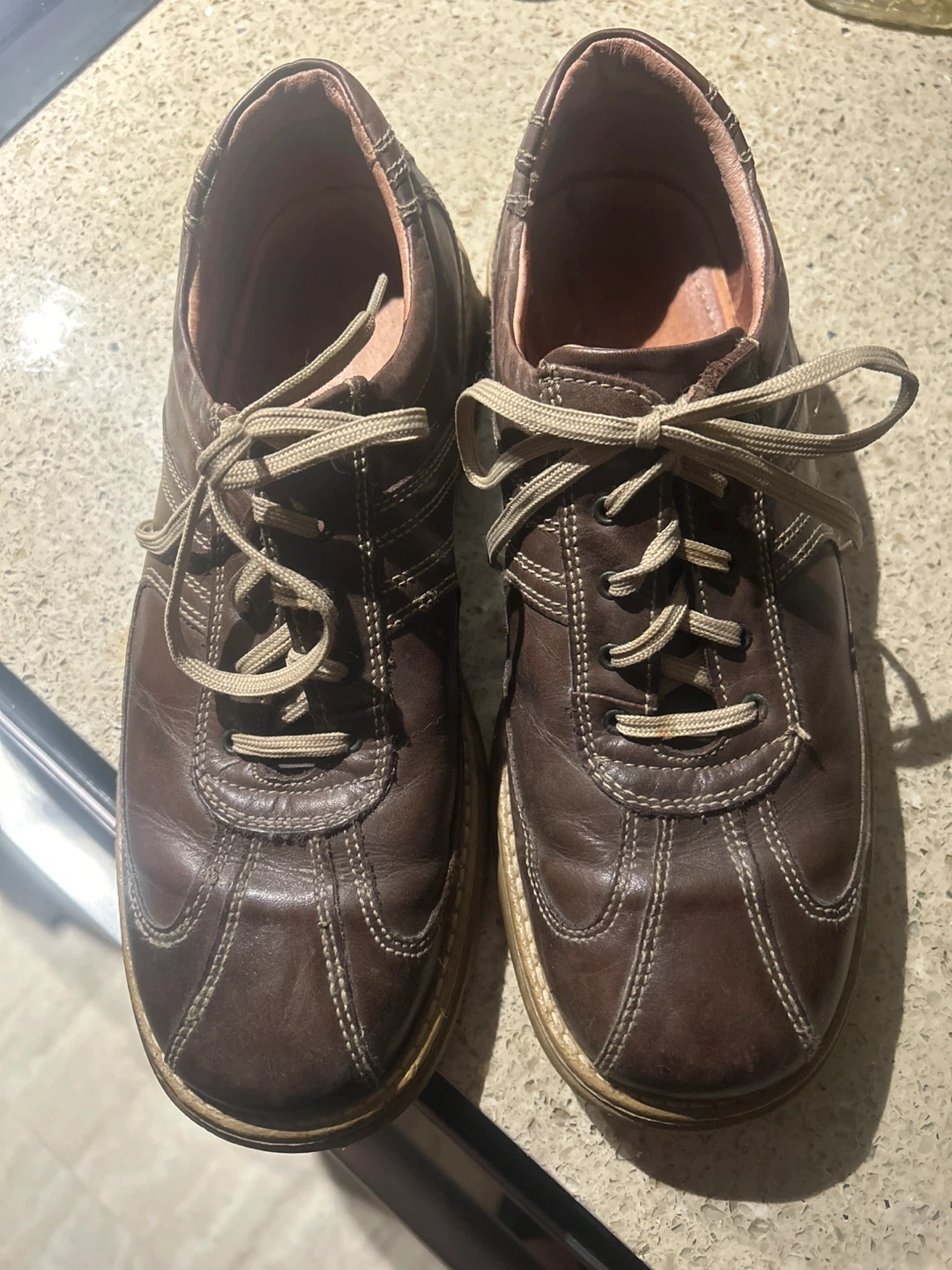 Pair of brown leather shoes. They are marked as size 43 which is a men’s size 10. They show signs of wear, but are very comfortable and still have lots of life in them