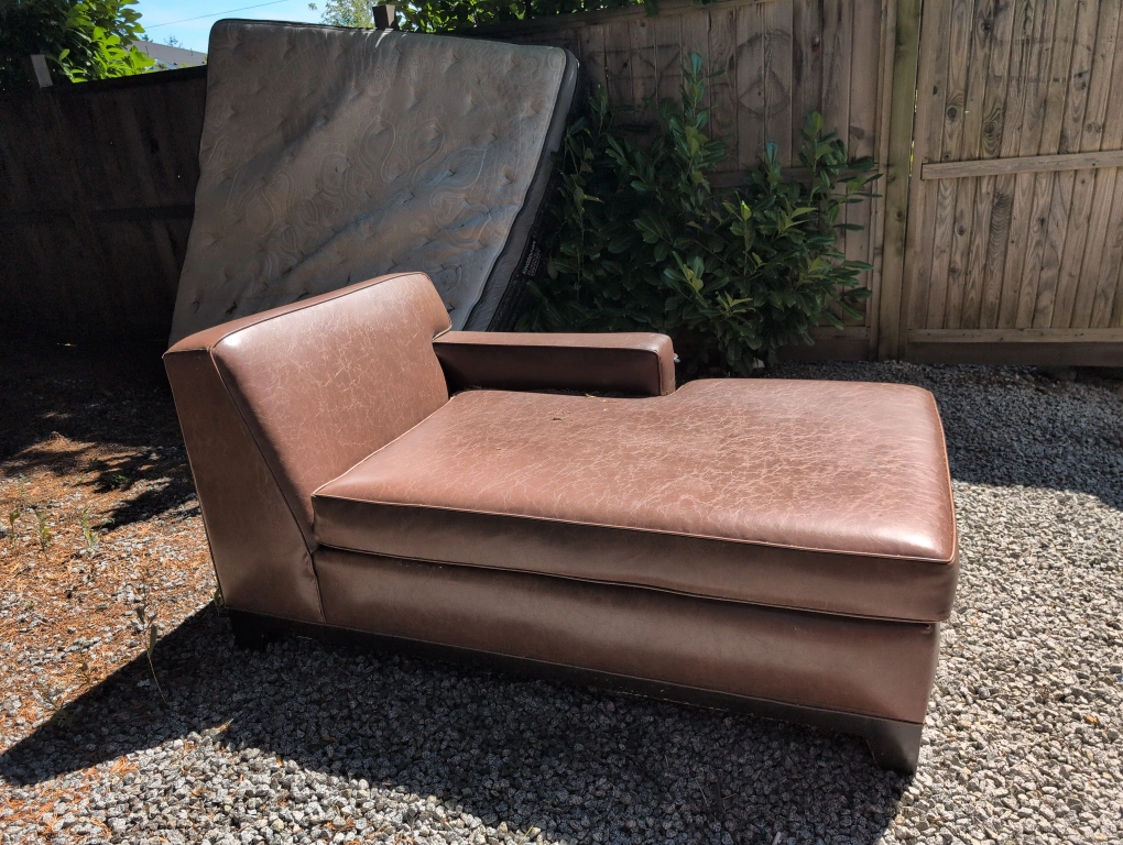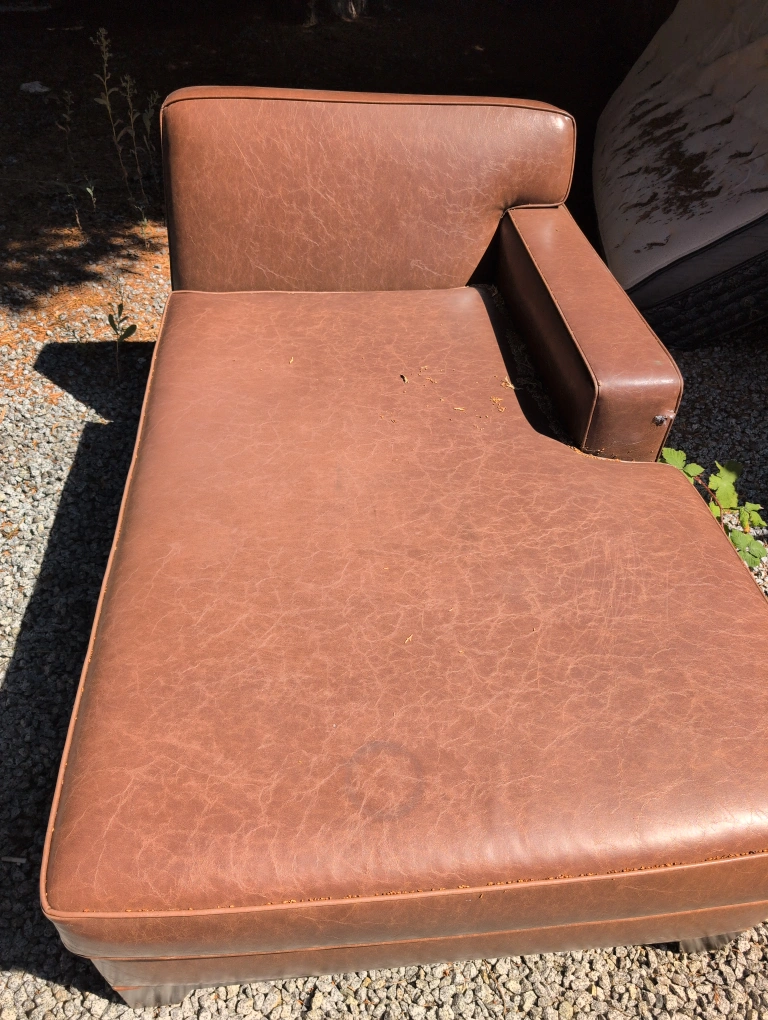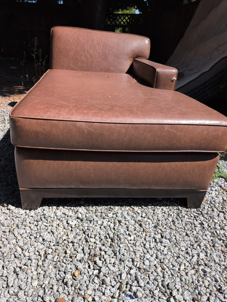 Selling a brown leather chaise lounge. It's in good condition and would be a great addition to any living room or bedroom. It has a unique design with an armrest on one side. It's quite comfortable for lounging and relaxing