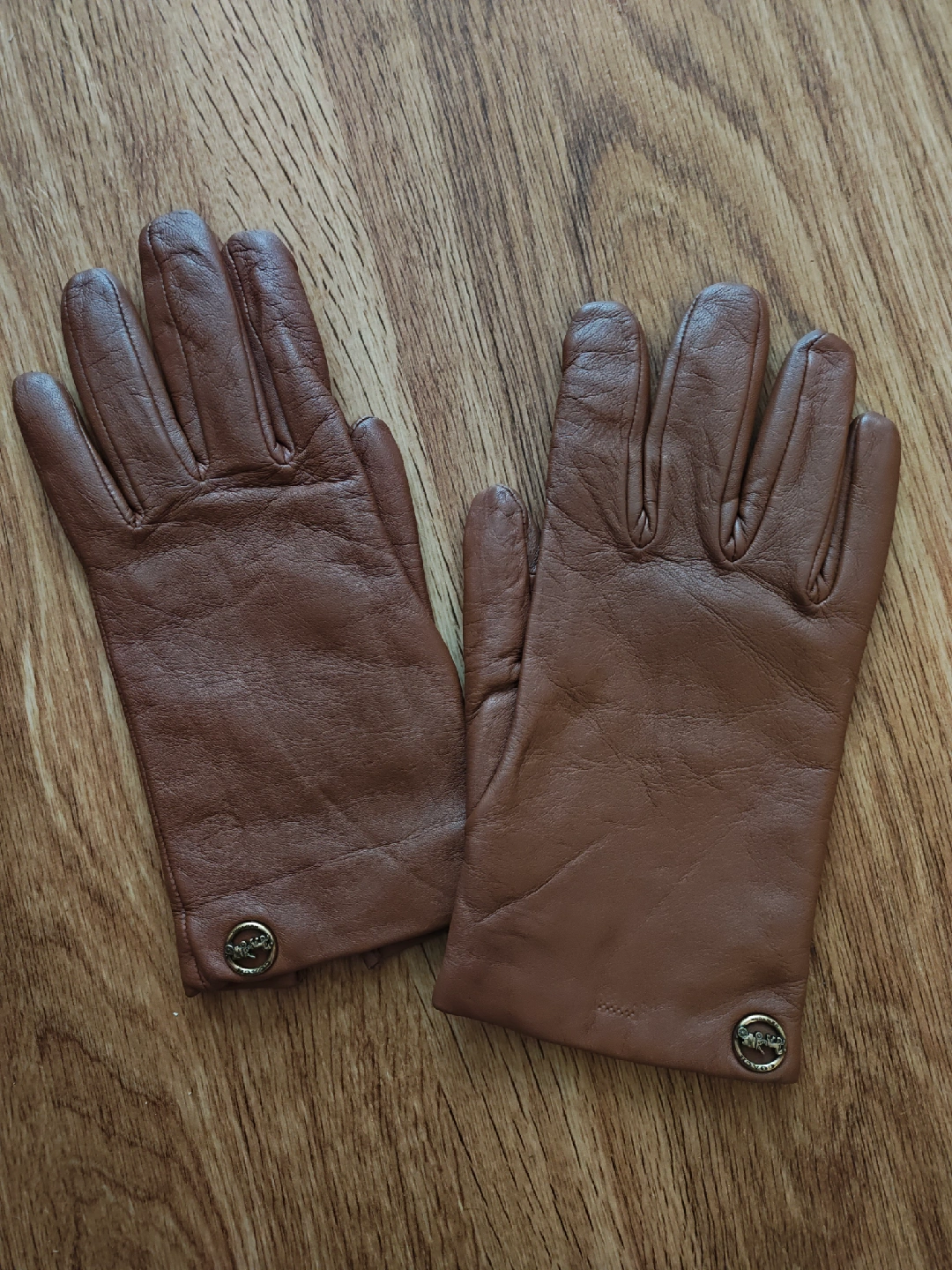 Brown leather glovez with brassy Coach logo. Perfect for small hands! The under side lf one of the gloves has signs of wear, otherwise, everything else is pretty good.