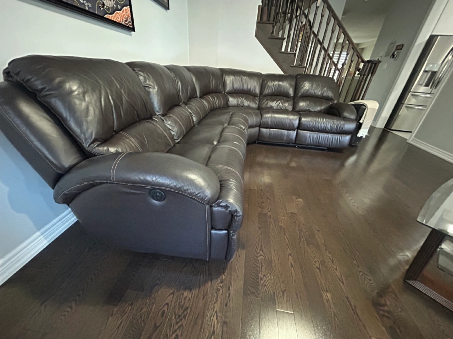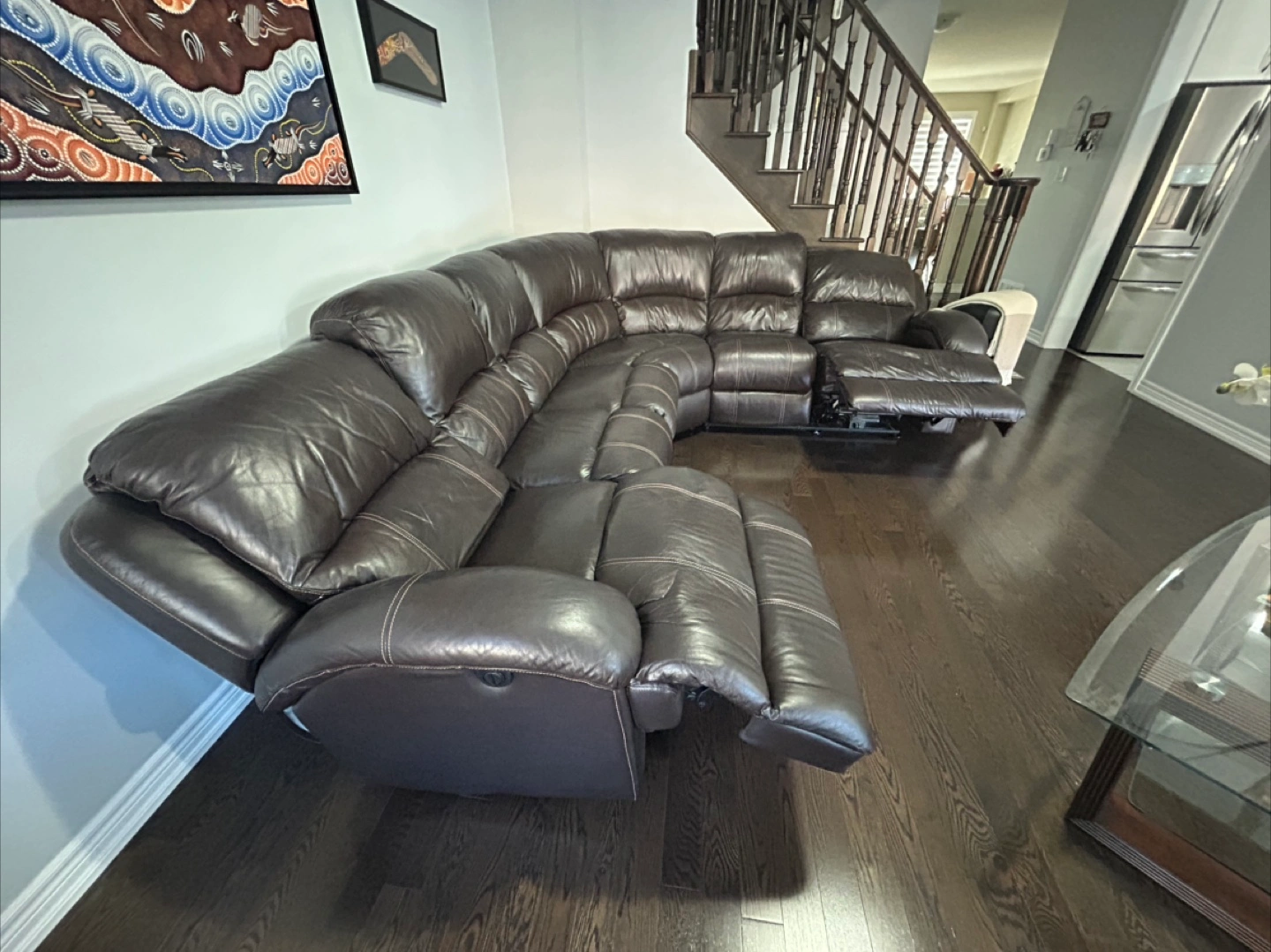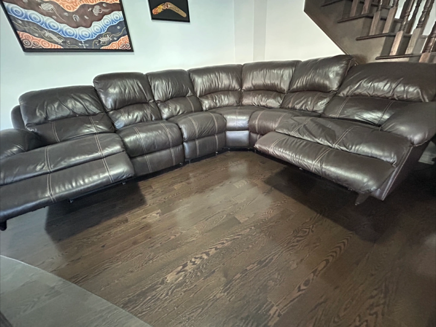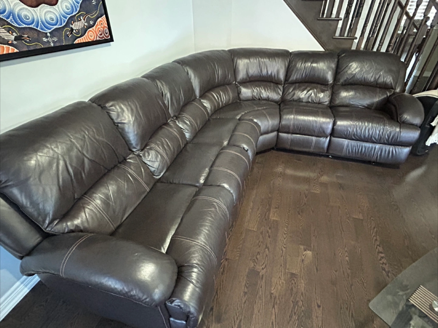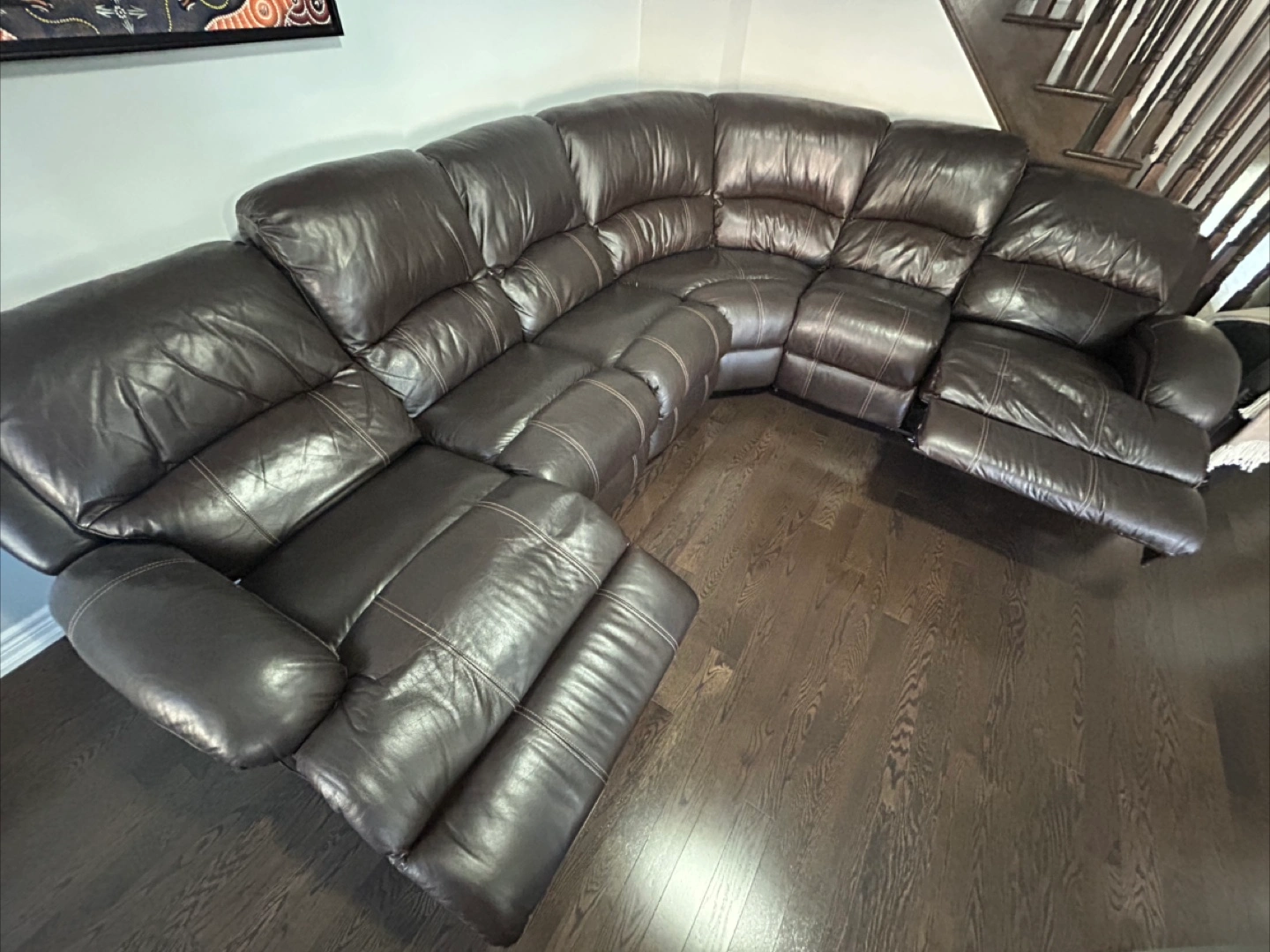 Selling a comfortable brown leather sectional recliner sofa. It's in good condition and perfect for a living room or entertainment area. The sectional design allows for flexible arrangement to fit your space. The recliner feature adds extra comfort for relaxing after a long day