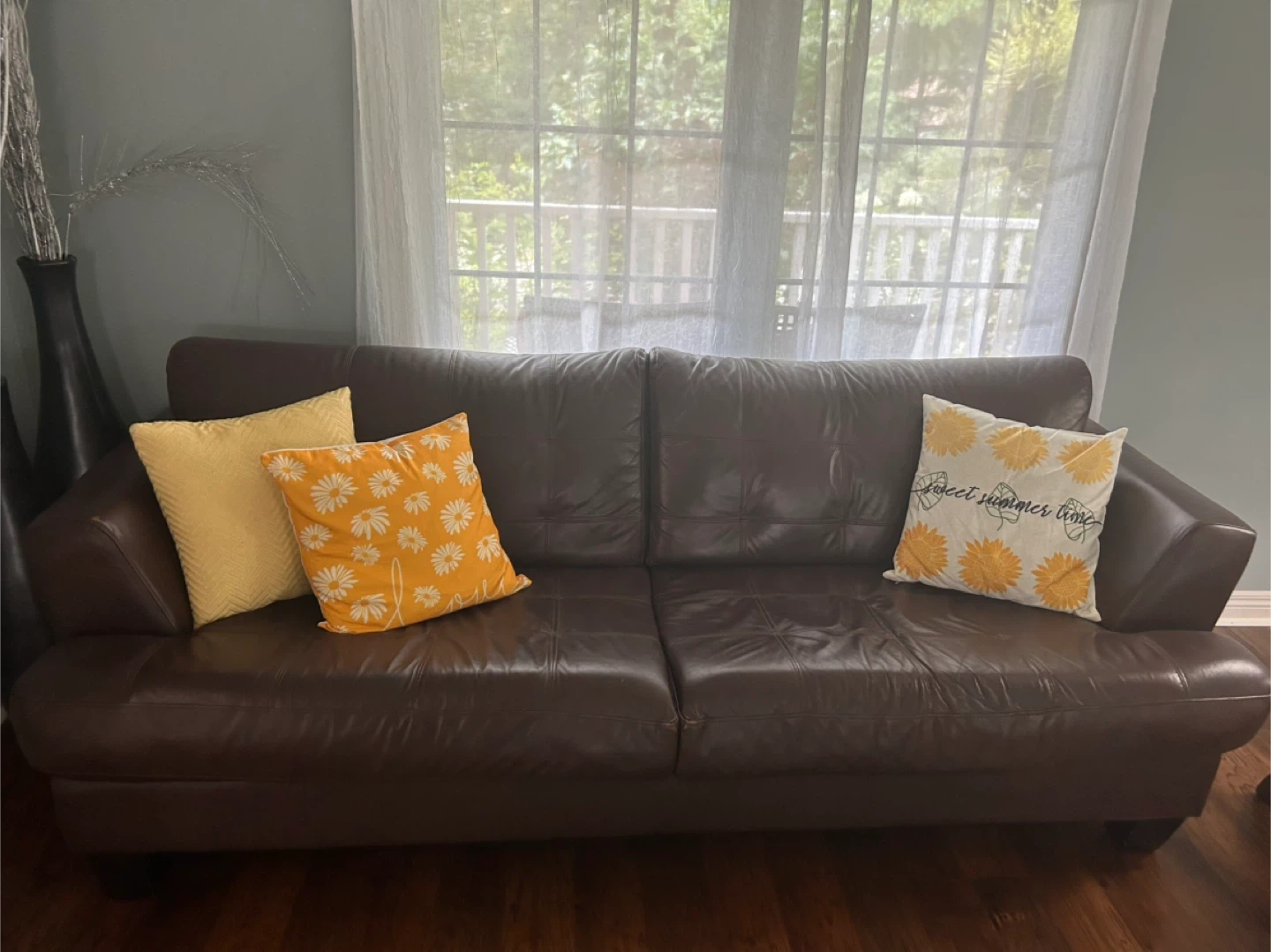 Selling a gently used brown leather sofa. It's a comfy piece for any living room. There are some signs of wear, but it's still in good condition and ready for a new home!