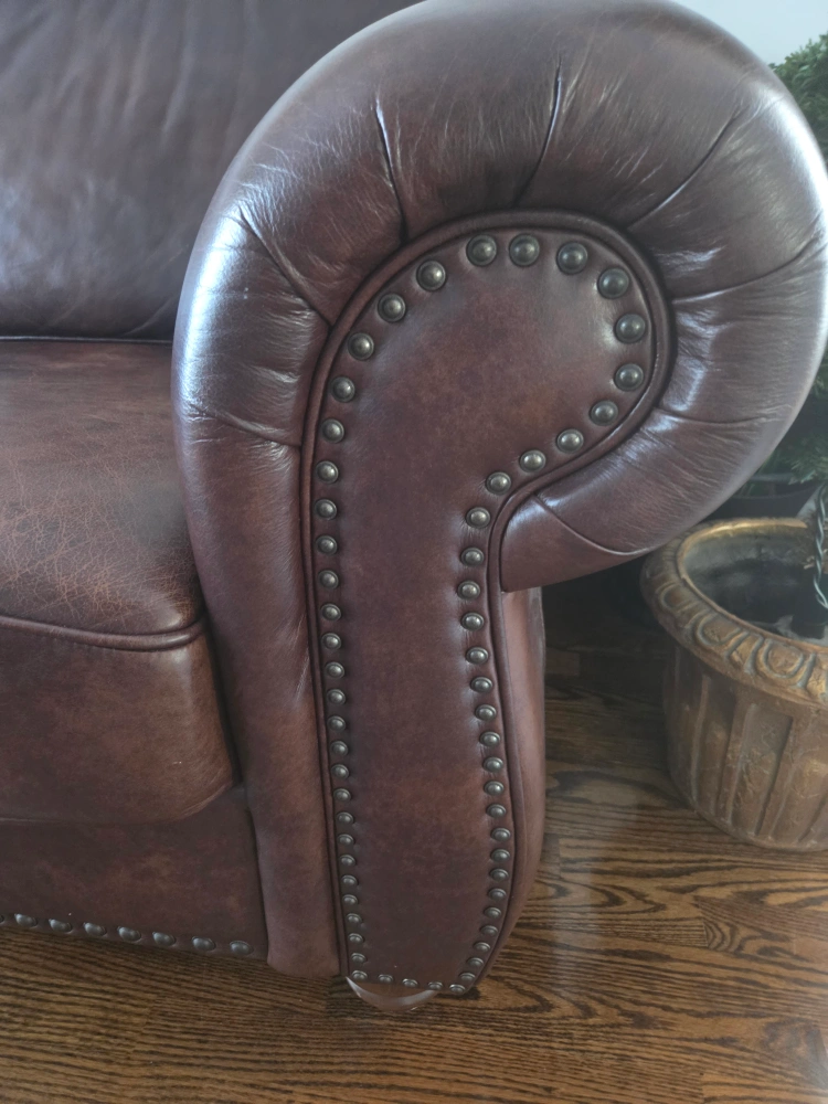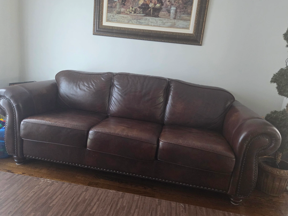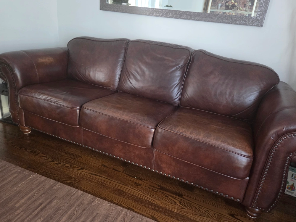 Selling a comfortable brown leather sofa. It's in great condition and would be a lovely addition to any living room. The leather has a beautiful, rich colour and the sofa features classic nailhead trim detailing.