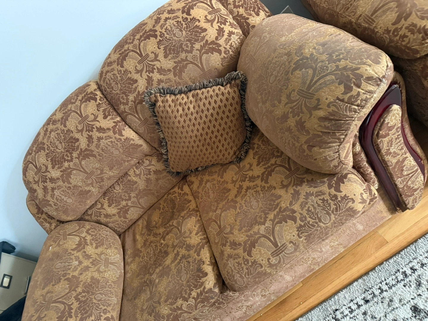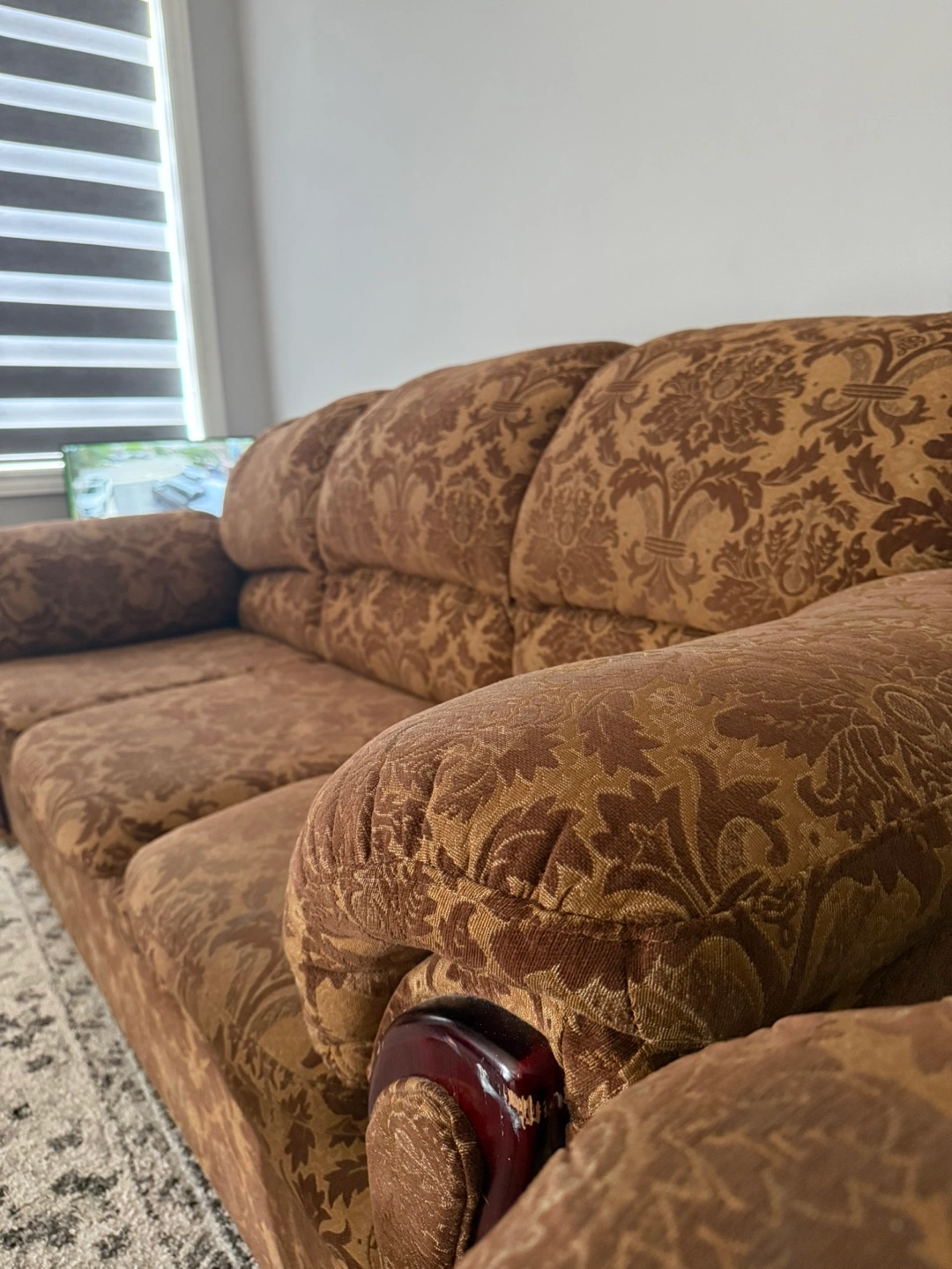 Selling a 3 piece brown patterned sofa set! It's in great condition and ready for a new home. The sofa features a unique floral pattern and sturdy construction. Perfect for adding a touch of classic style to your living room.