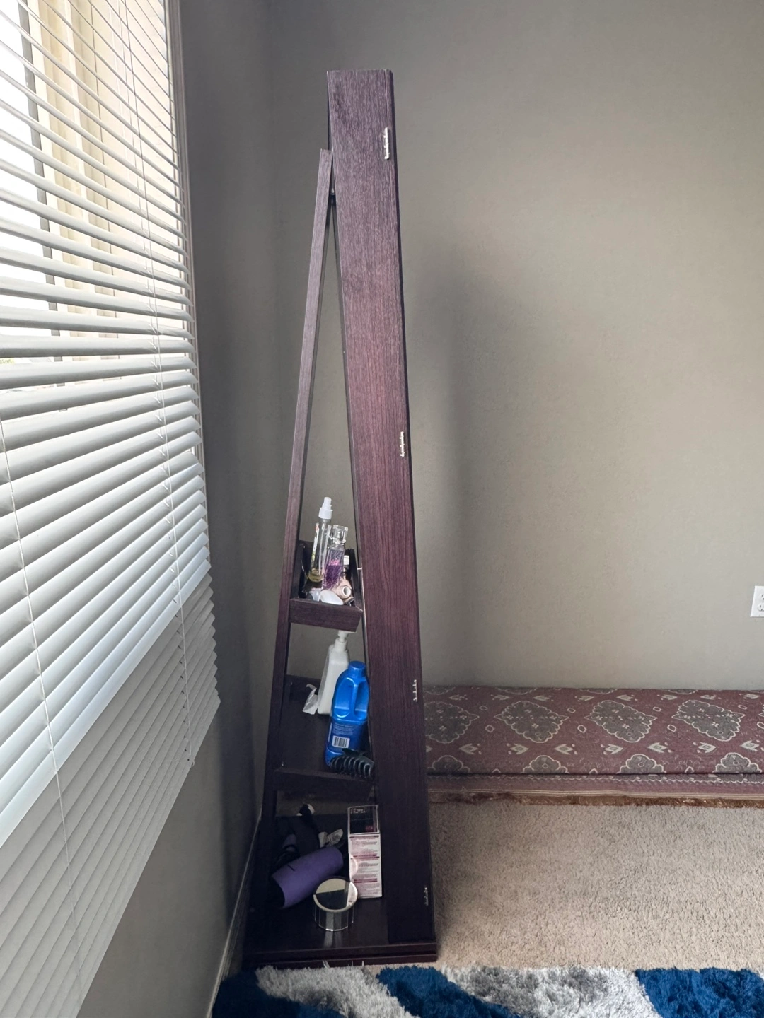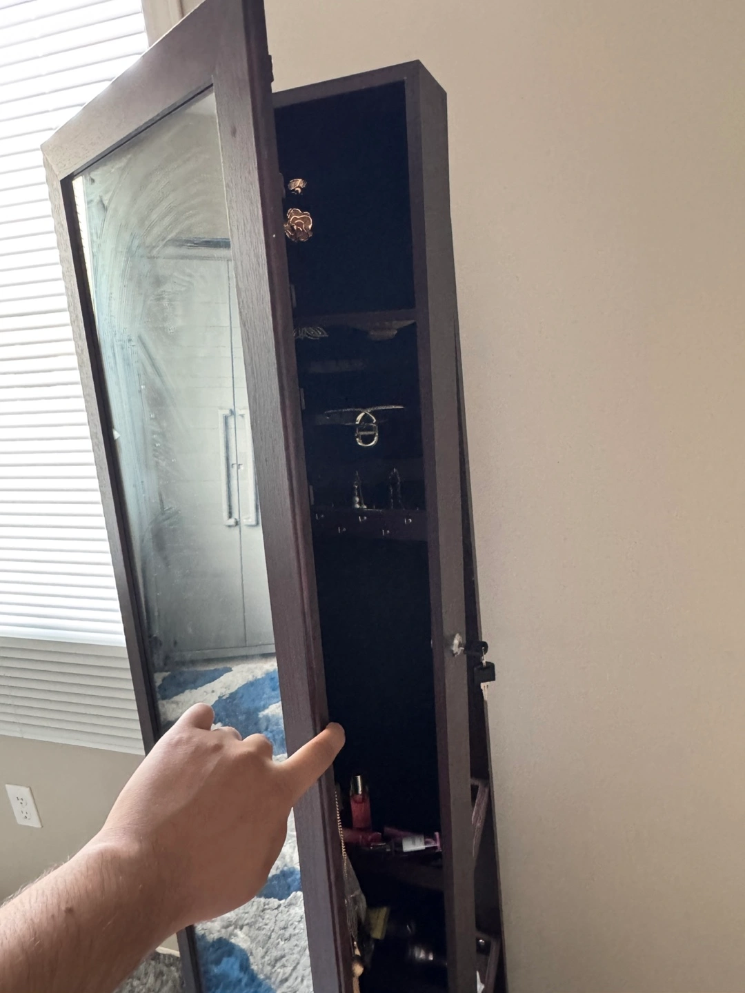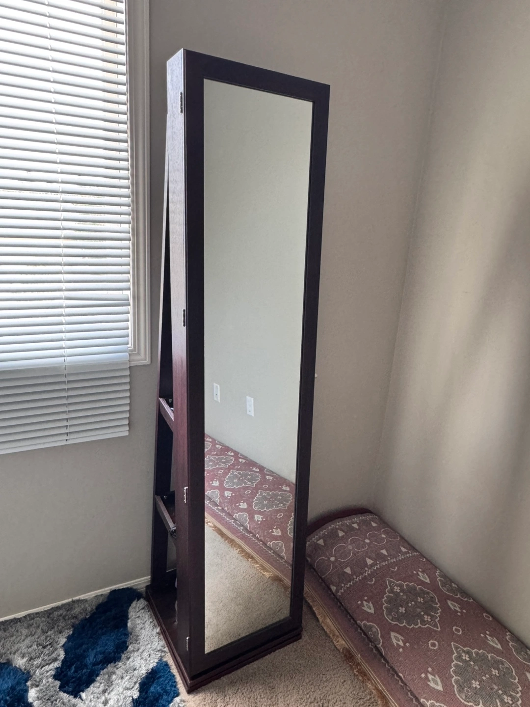 Selling a standing jewelry armoire with a mirror. It's a great way to keep your jewelry organized and easily accessible. The armoire is in good condition and has plenty of space for all your necklaces, earrings, and rings