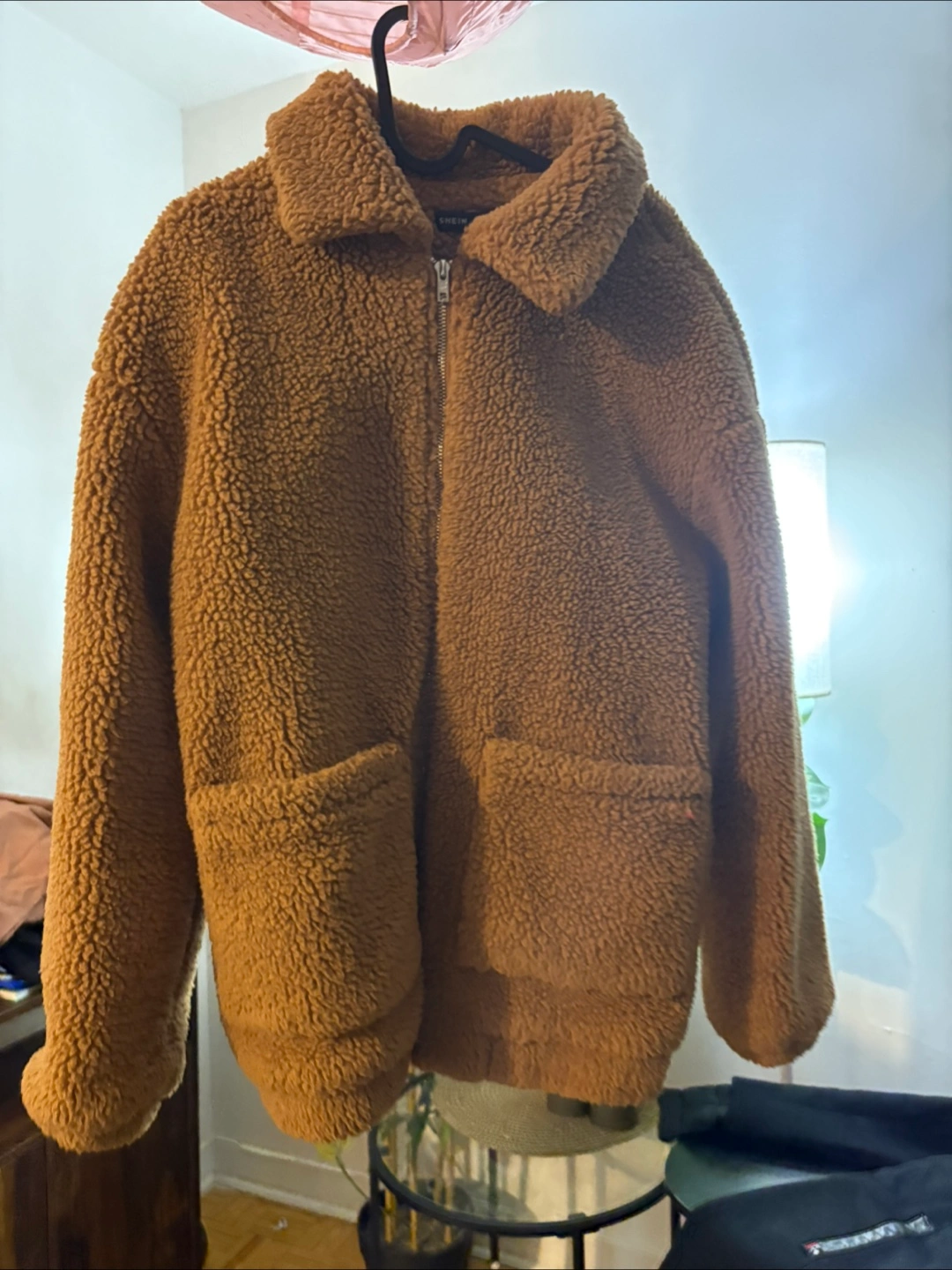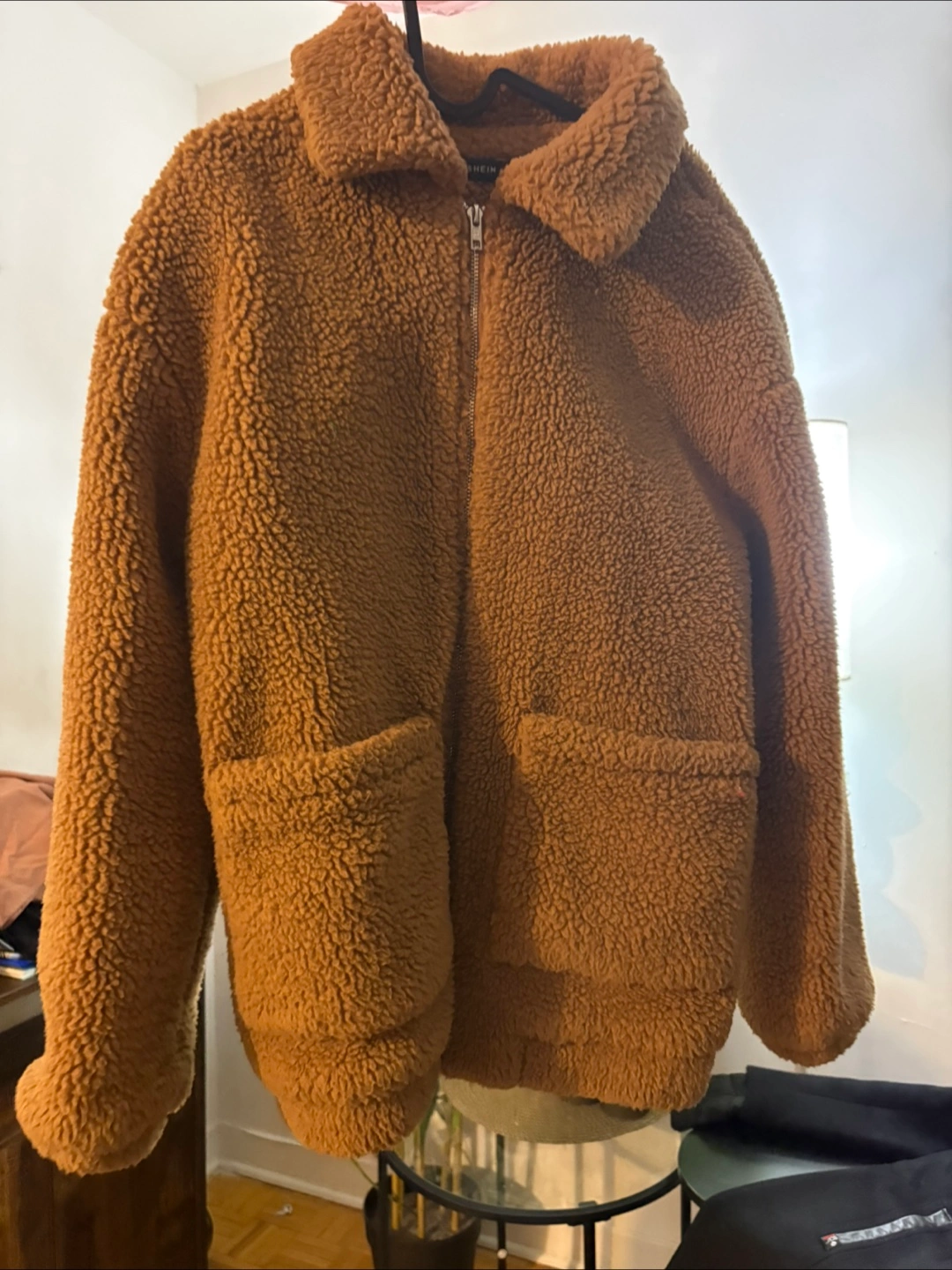 Cozy up with teddy jacket! It's a warm, fuzzy, and stylish addition to your wardrobe. Perfect for chilly days and evenings. It's in great condition and ready for a new home!