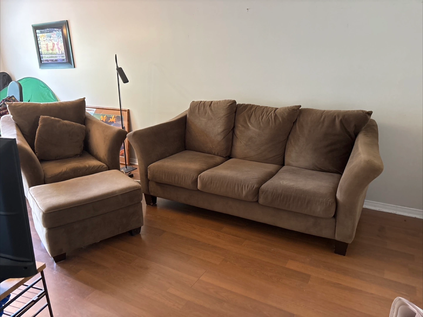 Clean solid and comfortable from a non-smoking home. Excellent condition. No tears, pulls or stains. Moving and it must go. A perfect set for your family, living or recreation room. Price negotiable Sofa is 84”X 38/ “chair is 32” X 34”/ Ottoman is 29” X