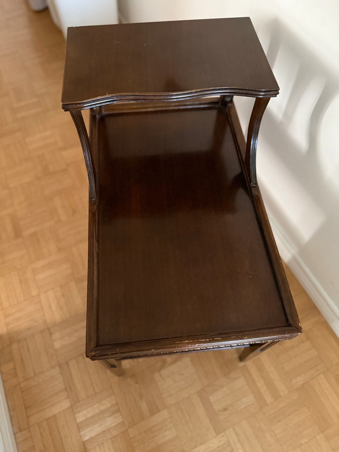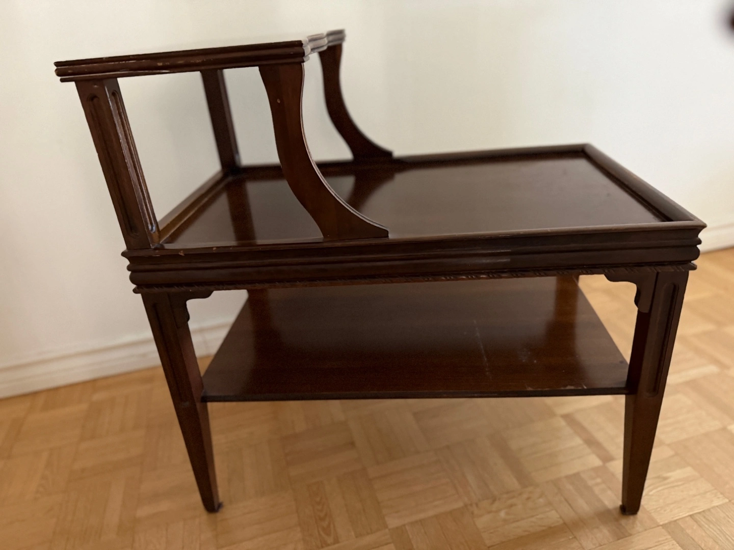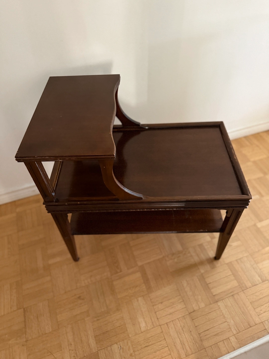 Selling a lovely brown wooden step table. It's in great condition and would be a perfect addition to any living room or bedroom. The table has two levels, providing ample space for books, lamps, or decorative items. Its unique design adds a touch of elegance to any space