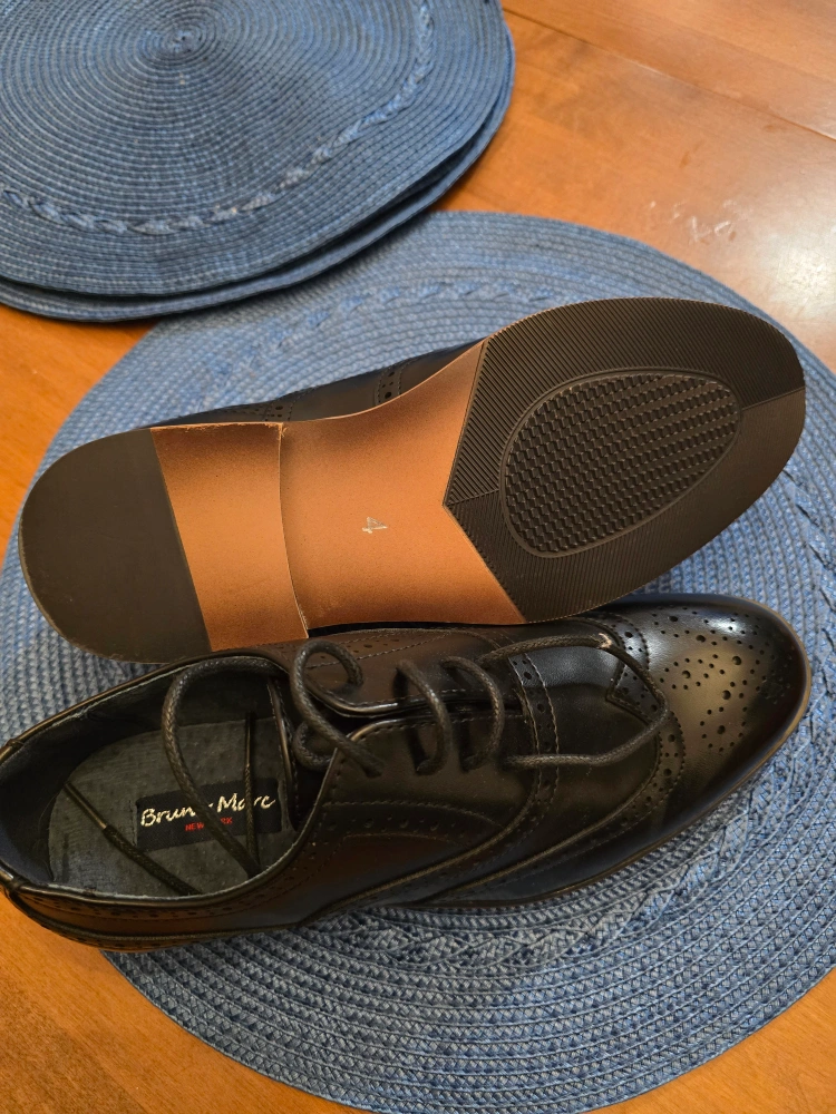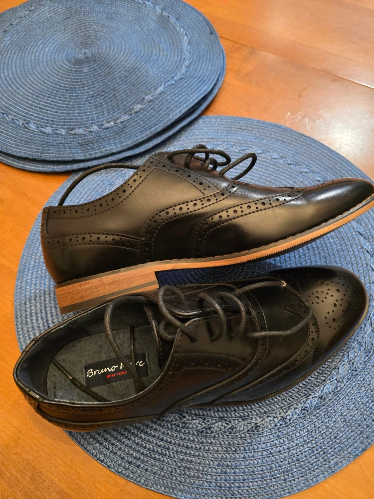 Here are some Bruno Marc men's wingtip Oxford dress shoes in black. They are in brand new condition and are a size 4. Never been worn. These dress shoes are perfect for any formal occasion.