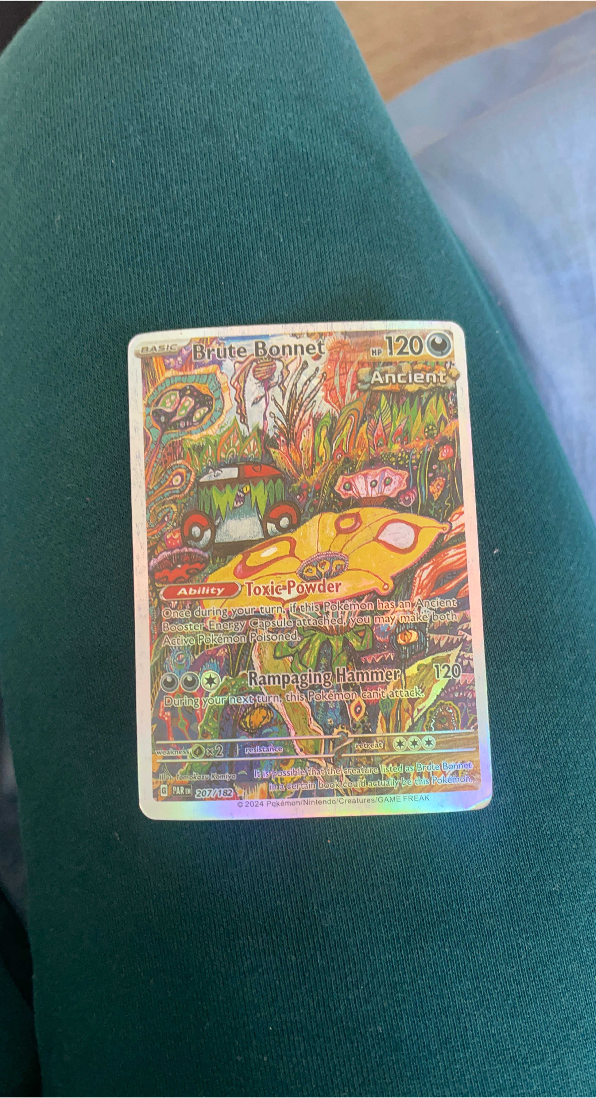 Selling a Brute Bonnet Pokemon card! It has 120 HP and the Ancient ability Toxic Powder. Its attack is Rampaging Hammer which does 120 damage. The card number is 207/182.