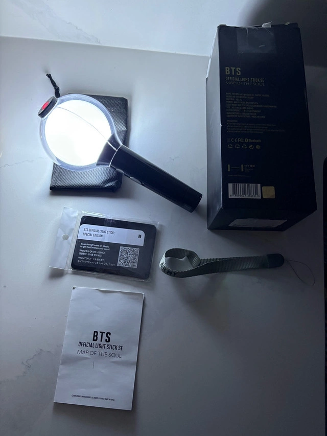 Selling a BTS Light Stick Special Edition, also known as a ARMY BOMB, that is in excellent condition and perfect for any BTS fan looking to enhance their concert experience or collection. This light stick features vibrant lighting and is fully functional. Includes original box, strap, and RM photo card sealed.