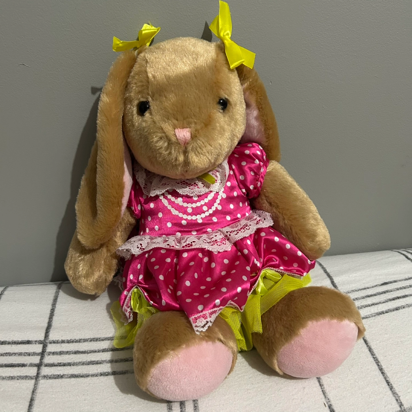 Selling a Build-A-Bear bunny. It's wearing a cute pink polka dot dress with white lace and a yellow underskirt. It also has yellow bows on its ears. The bunny is in great condition and ready for a new home! Dress is part of the Lalaloopsy Build-A-Bear collection $15 OBO