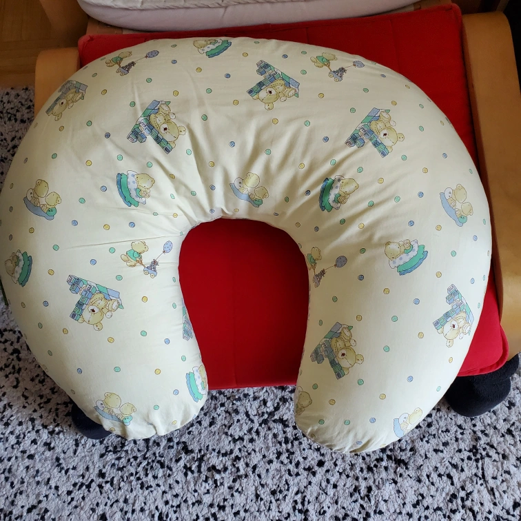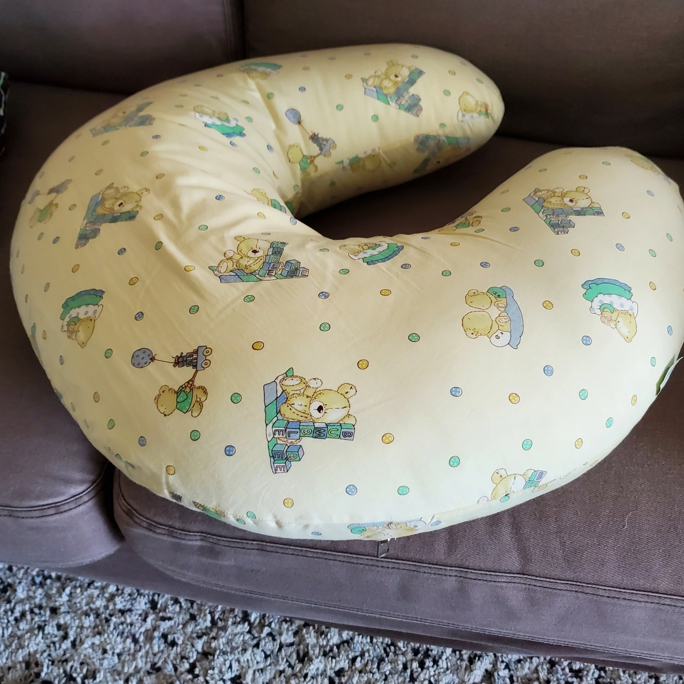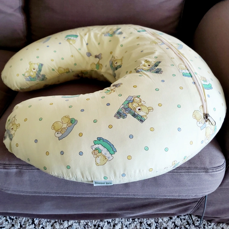 A gently used Bumble Bee nursing pillow in good condition! It features a cute teddy bear pattern on a light yellow background. Perfect for supporting your little one during feeding time.