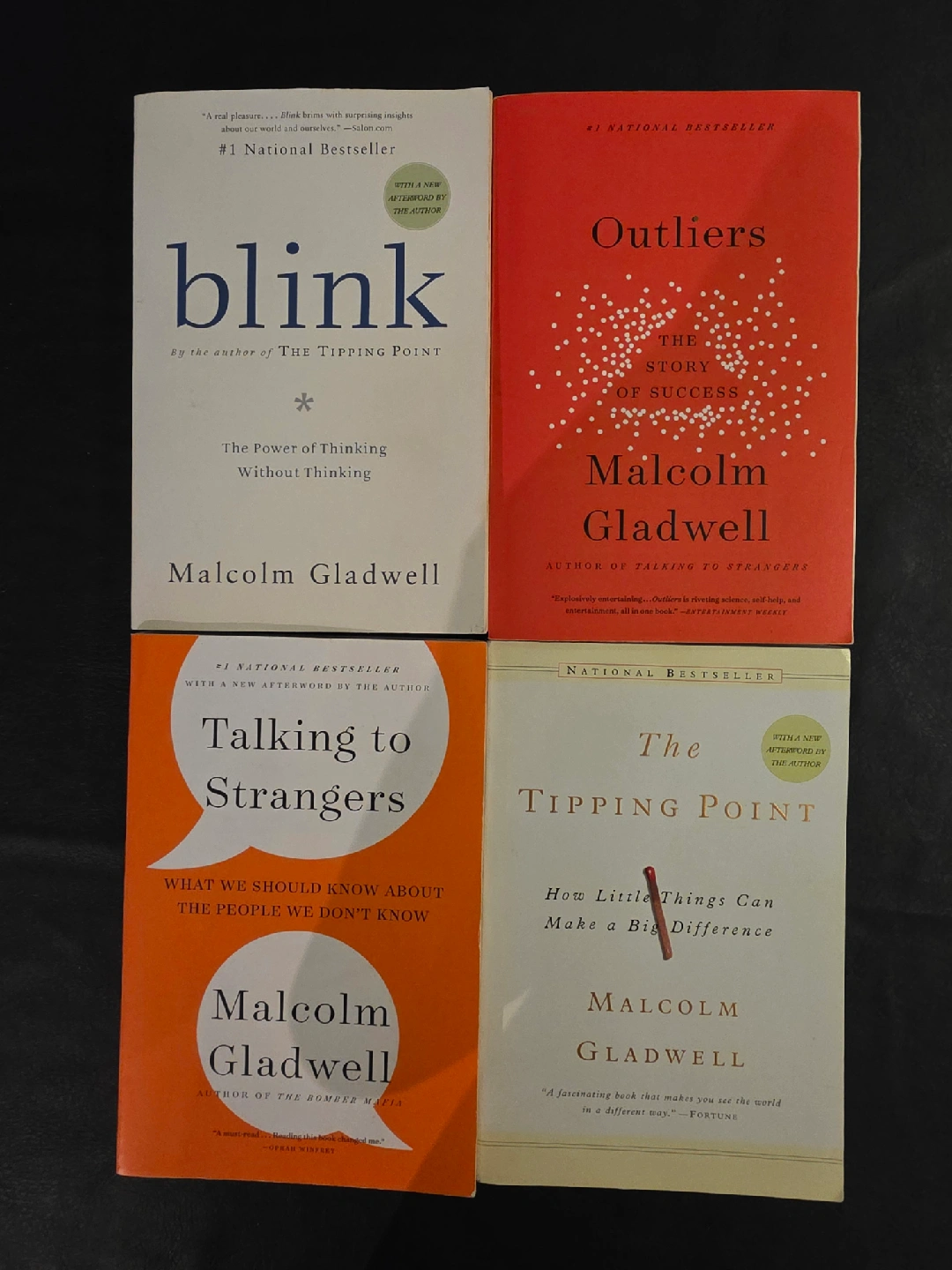 Selling a collection of Malcolm Gladwell books! Includes: - The Tipping Point: How Little Things Can Make a Big Difference - Outliers: The Story of Success - Blink: The Power of Thinking Without Thinking - Talking to Strangers: What We Should Know About the People We Don't Know All books are in great condition
