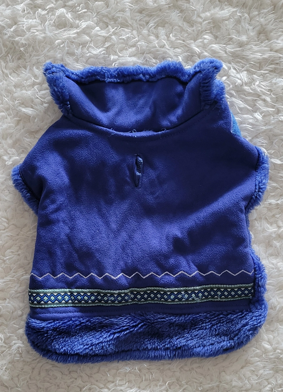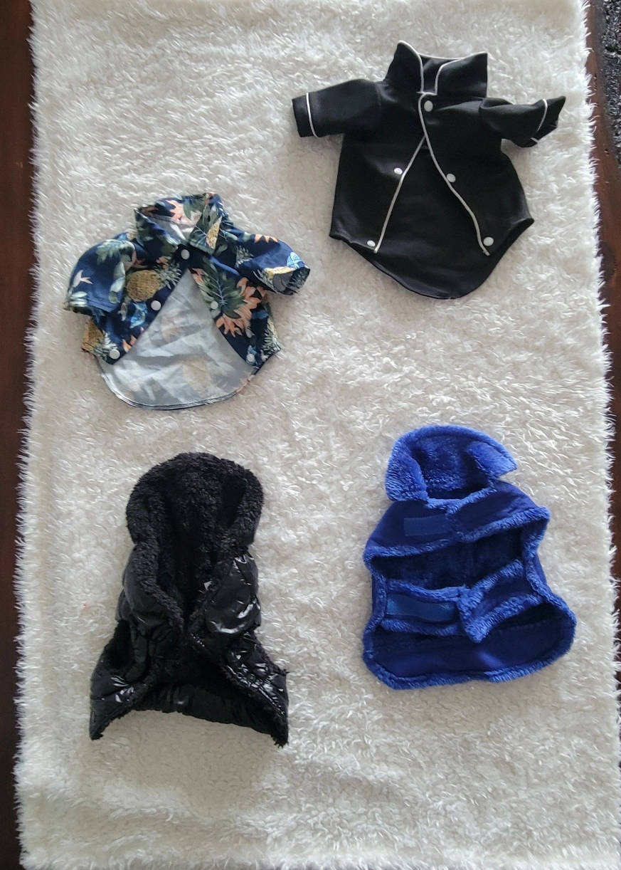 Four adorable small dog outfits. One black collared shirt, one blue pineapple print shirt, one black puffer jacket, and one blue hooded jacket. Perfect for 12-15 lbs medium-sized male dogs Check out my other listings for other great items! Pickup only at Brimley and Eglinton Rd in Scarborough