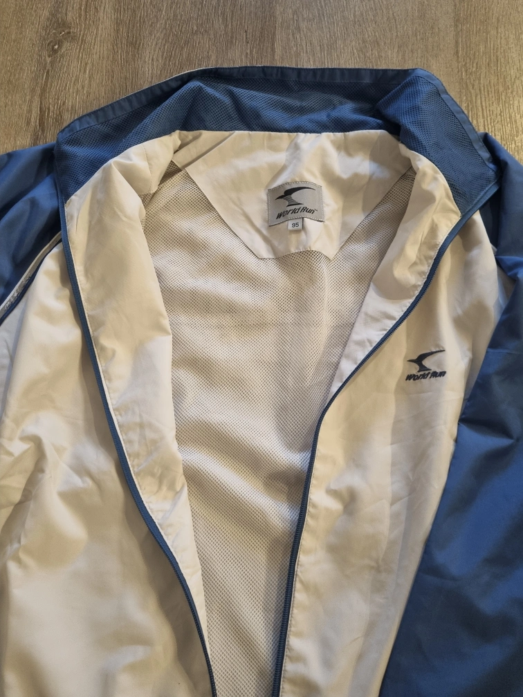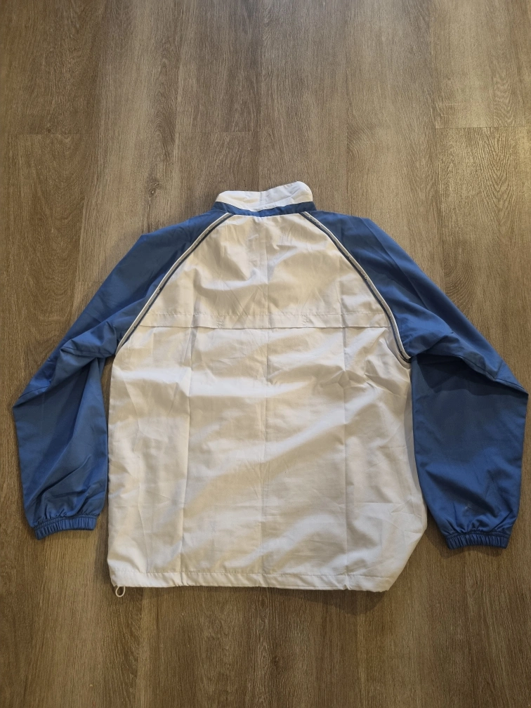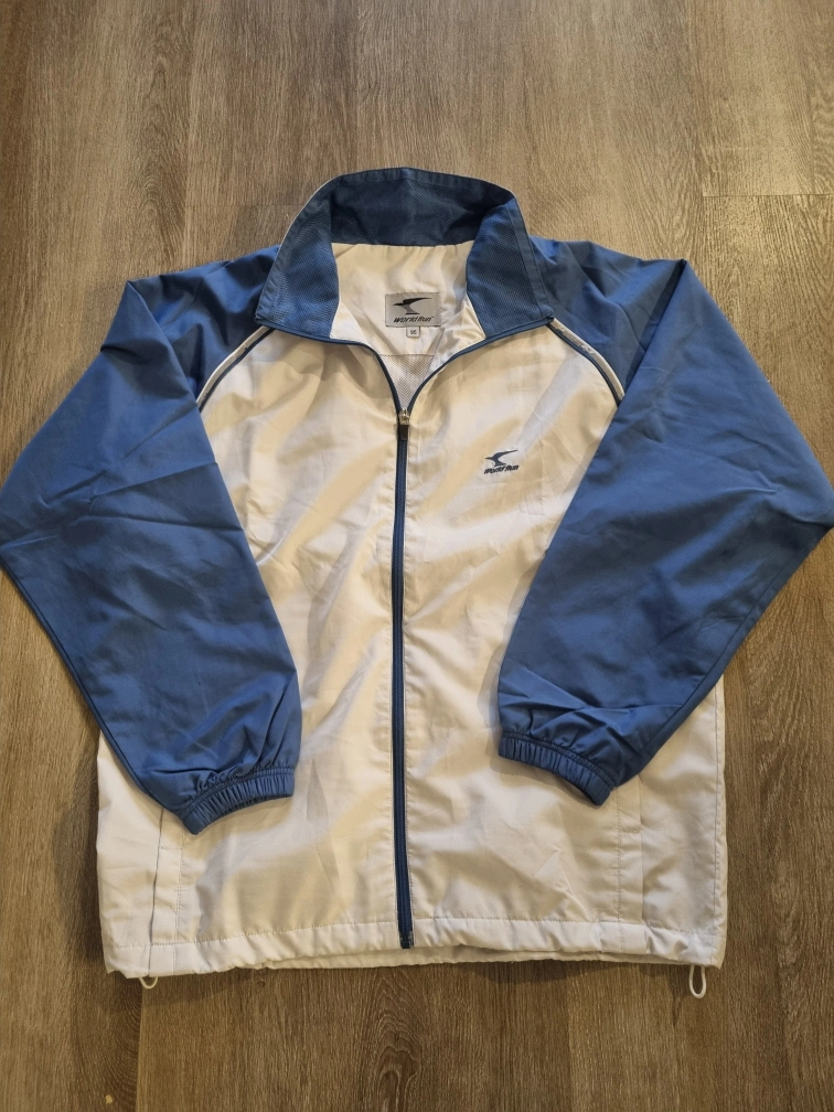 tracksuit. Jacket and pants. Blue and white colour block design. Size medium. Full zip jacket. Elastic waistband pants. Zippered pockets. $5 for each $8 for bundle