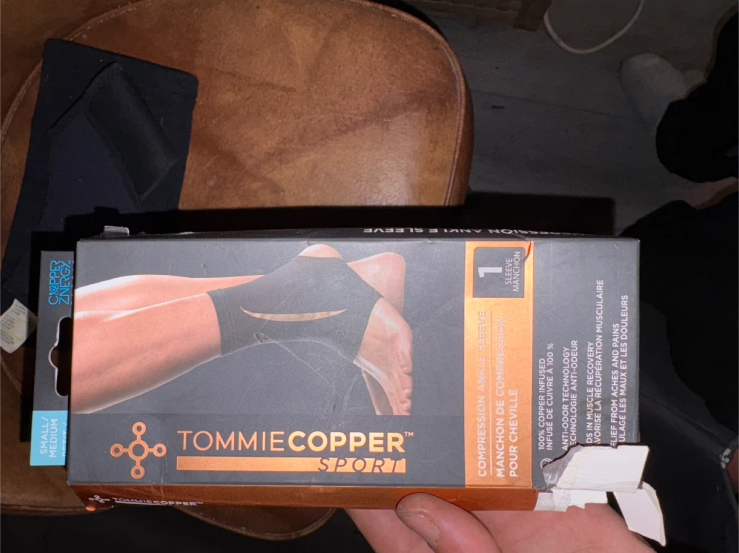 Selling a Tommie Copper Sport Compression Ankle Sleeve in size Small/Medium. This sleeve is designed for muscle recovery and relief from aches and pains. It also features anti-odour technology. All 3 I used 2 of them once my self they are still like new 1 is still in its case new Each of them are like 20 at stores ? I’ll do all 3 for 10