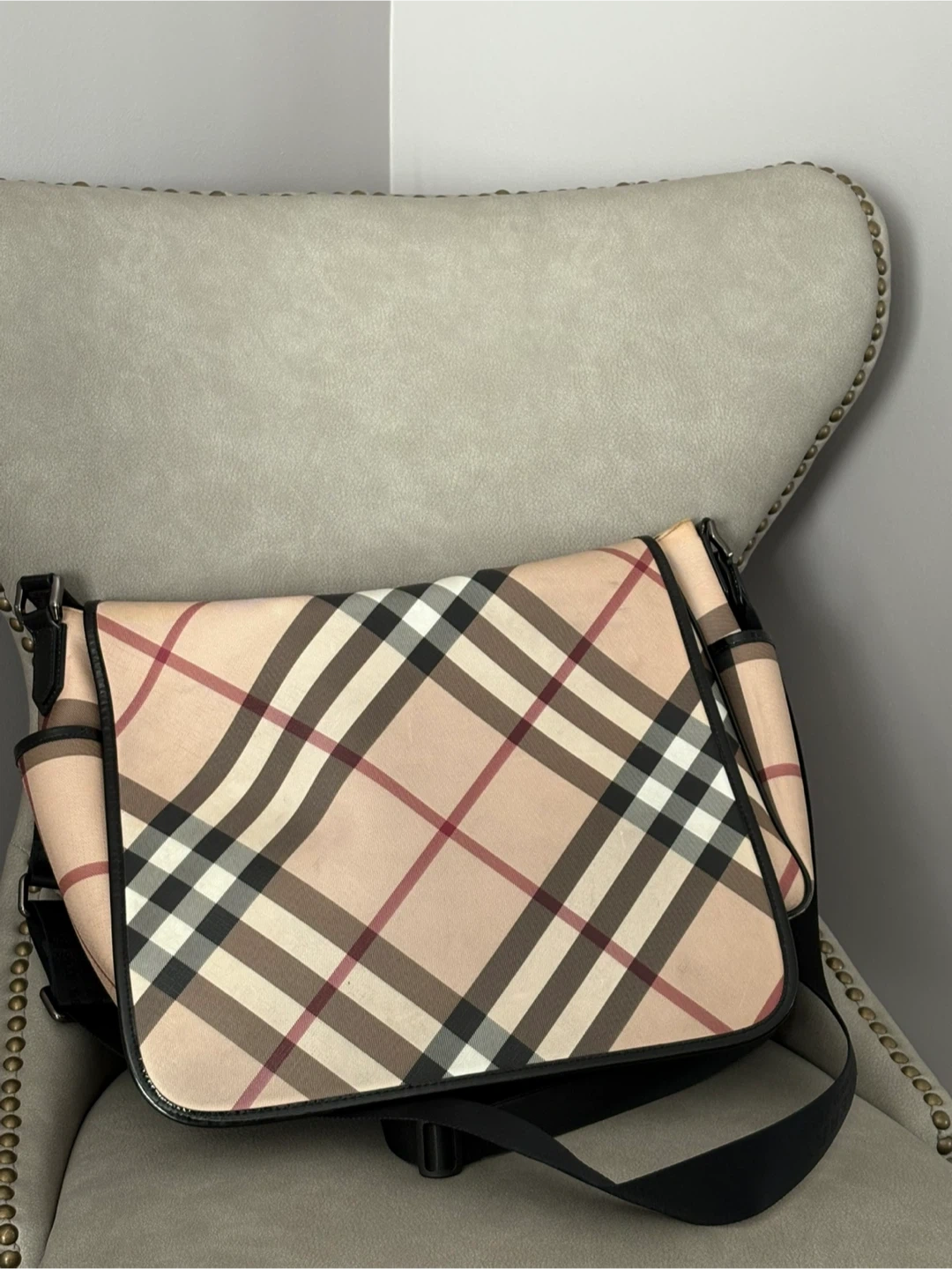 Selling a Burberry messenger bag with the classic Burberry check pattern. It has a black strap and trim. It's in great condition and ready for a new home!