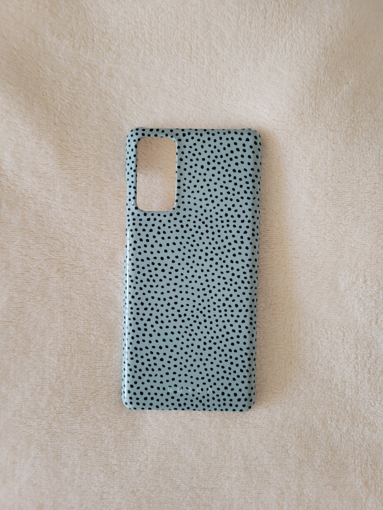 Mint green phone case with black polka dots. Includes Burga drawstring pouch. Compatible with Samsung Galaxy S20 FE.
