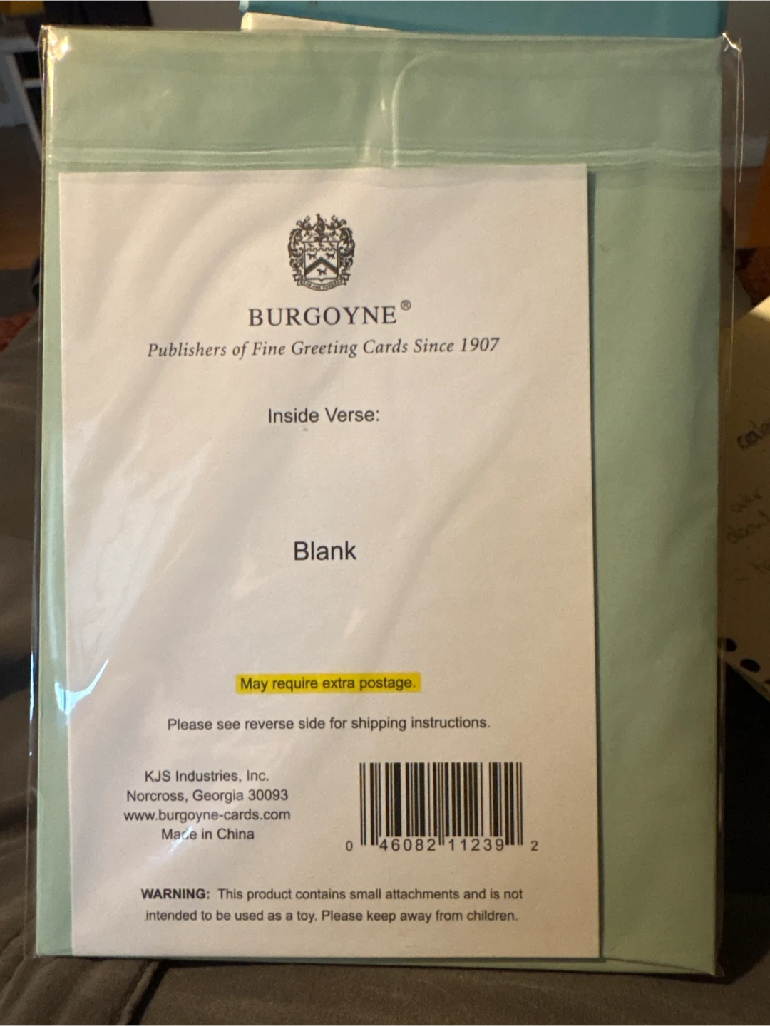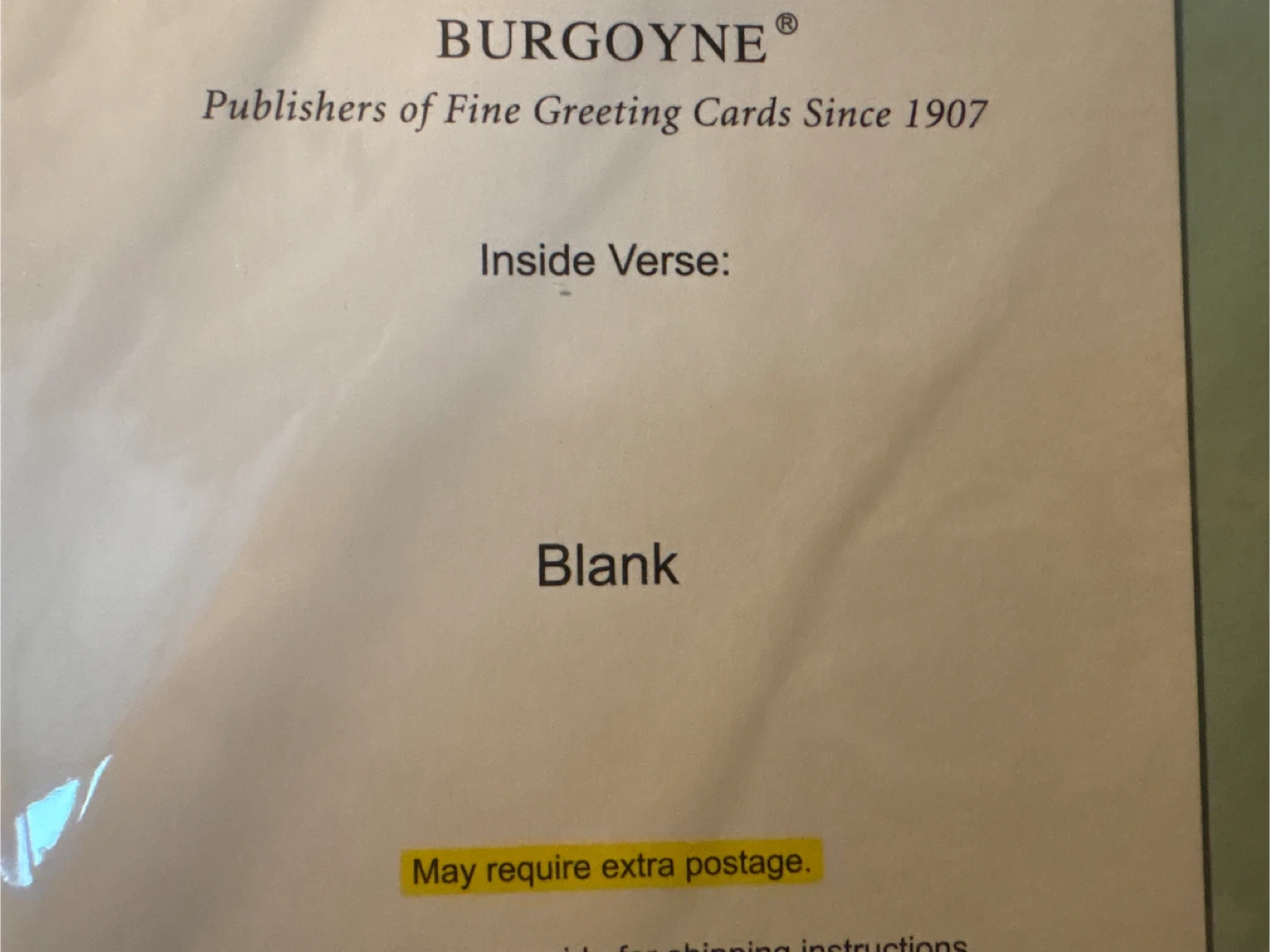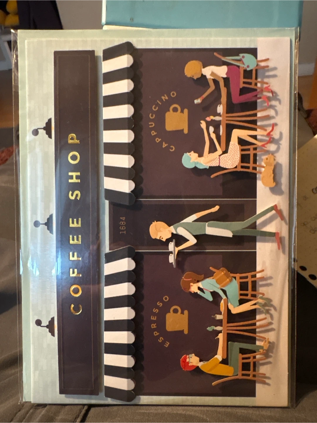 Here's a brand new Burgoyne greeting card featuring a cute coffee shop design! The inside is blank, so it's perfect for any occasion. May require extra postage.