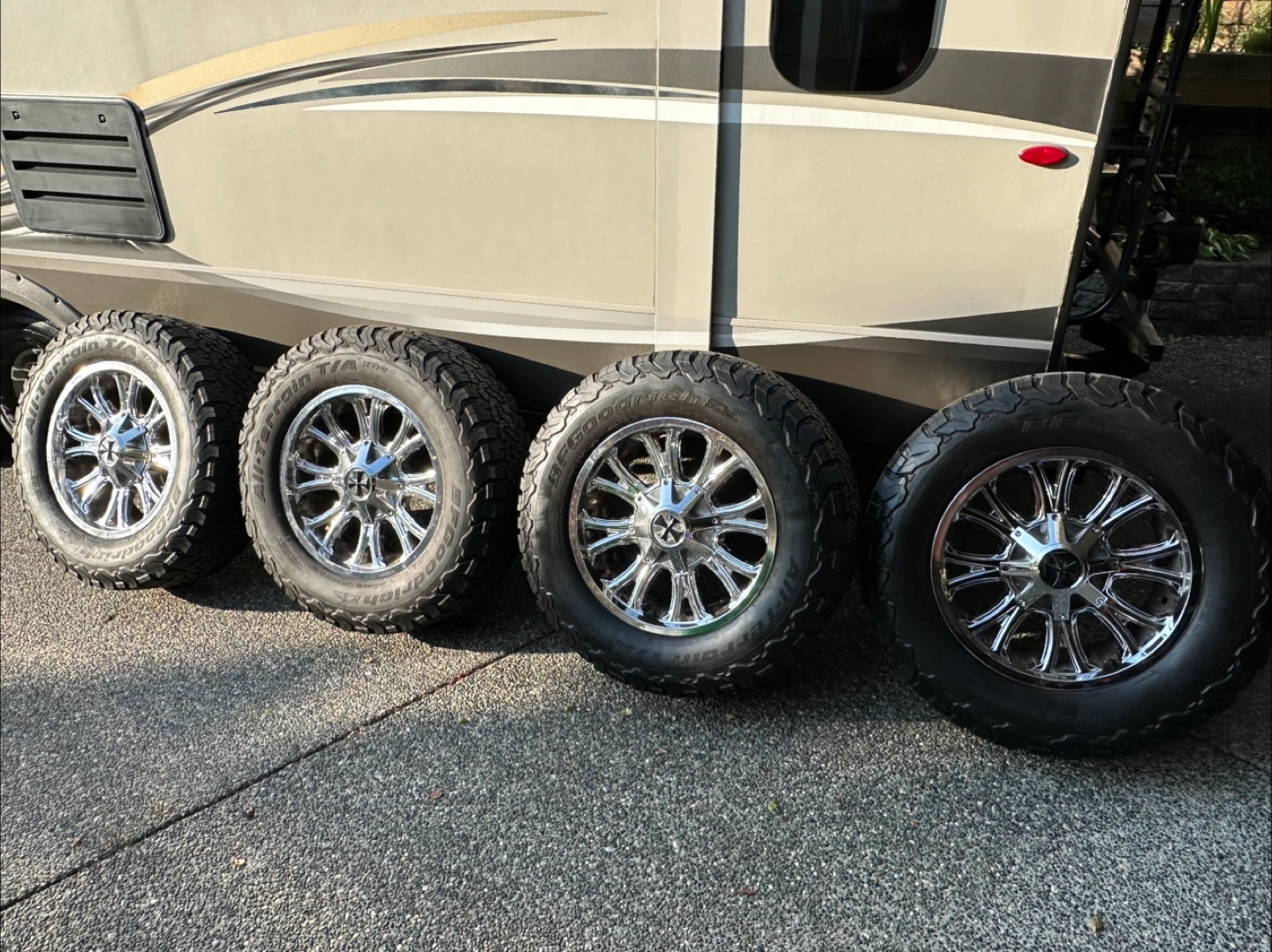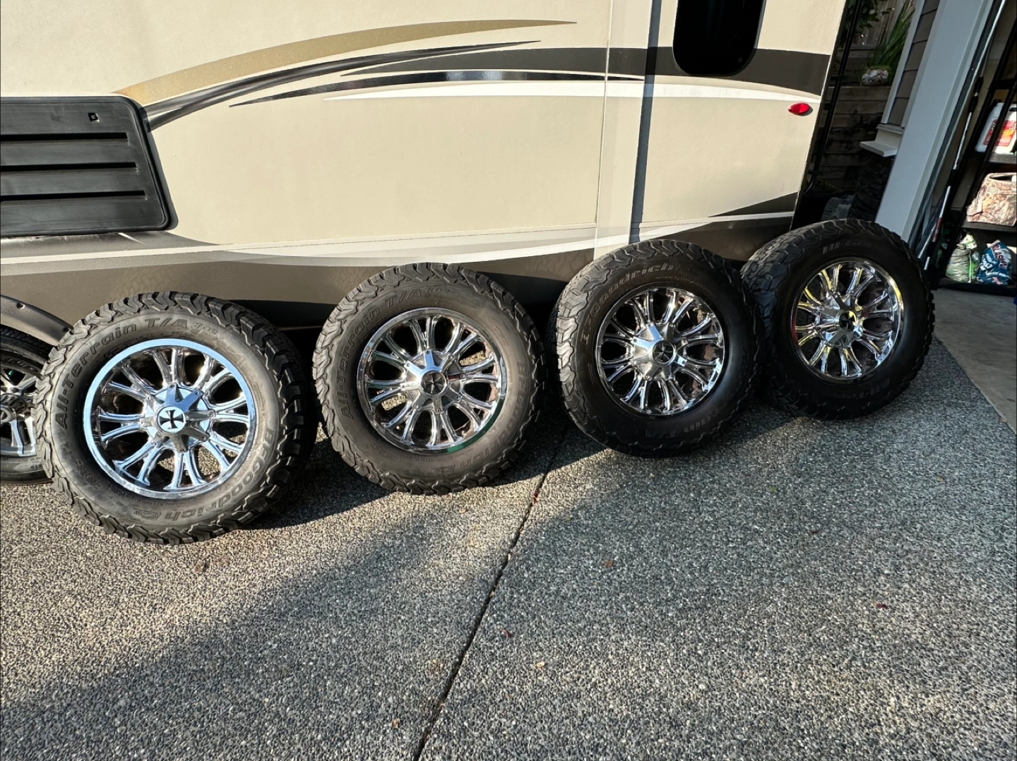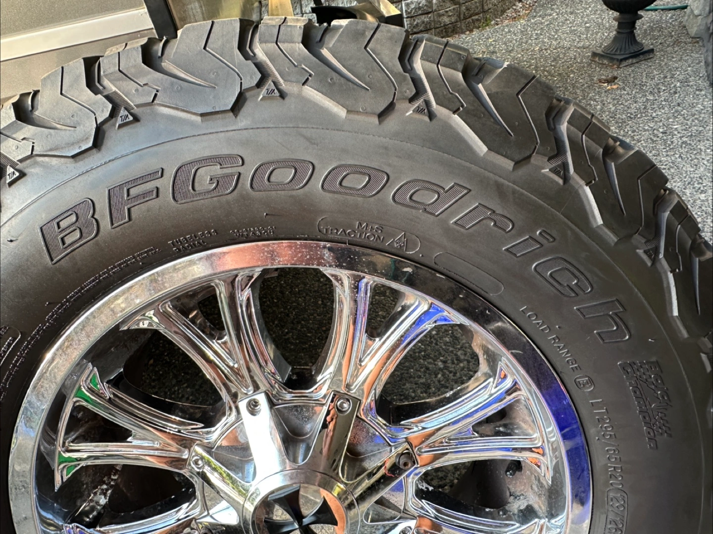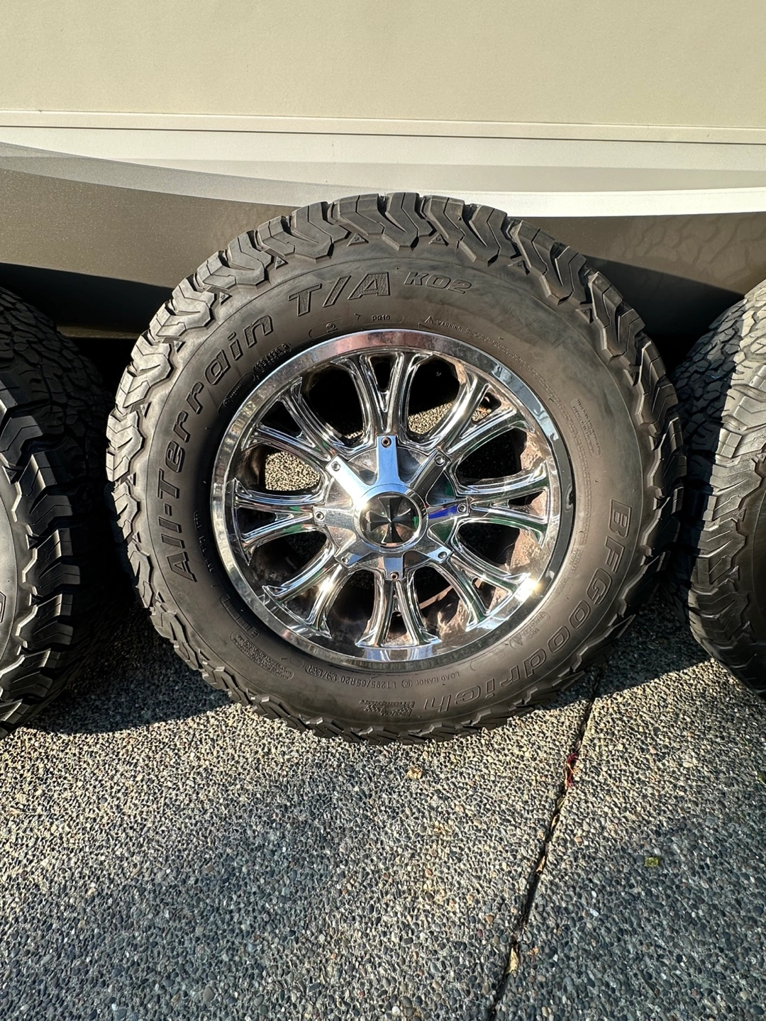 Selling a set of Cali Off-Road Americana PVD2 wheels. Looking for a good set of Aftermarket rims for your Ford? You found the right listing,20” Cali chrome wheels wrapped in BF Goodrich baja Champion KO2’s . Definite pitting on backside but still in good condition. Never been curbed no damage at all and do not leak at all. Tires have about 65-70% tread on all 4 . These run quiet on the street and are excellent in the rain. They are all terrain t/a KO2’s and the size is LT295/65/R20 (129/126R)-Tires are in fantastic shape and only just over 2 years old and rated Mud & Snow. They have no repairs or plugs in any of them! They came off my 2016 F-350 and are 8 bolt with a multi pattern as well come grab em Further Information: See pics for offset/ bore of rims and additional photos of how they look under a 2016 f-350 - fitment how far they protrude etc Specs: - Size: 20x12 - Bolt Pattern: 8x165.1 / 8x170 - Offset: -44 - Finish: PVD2