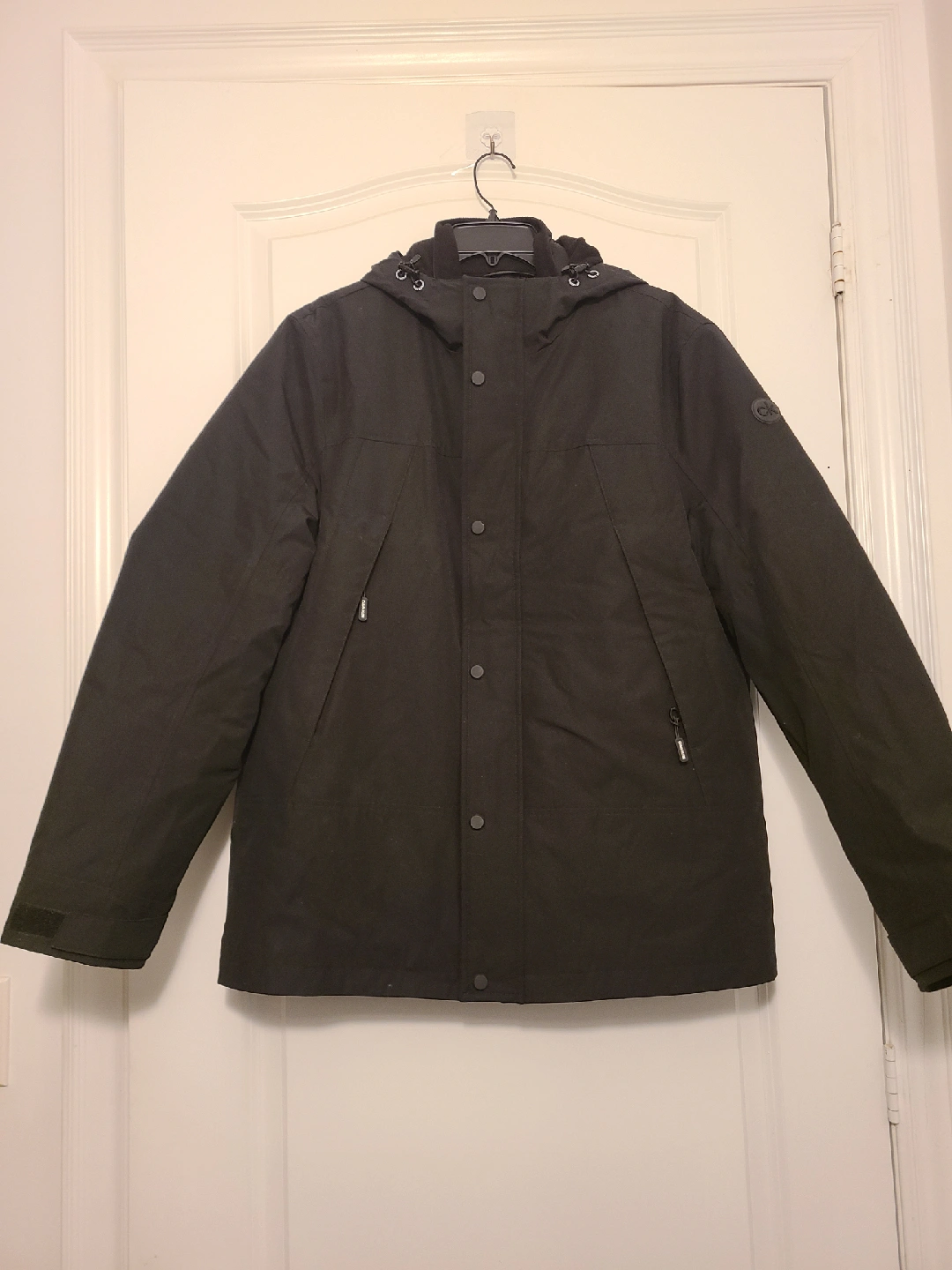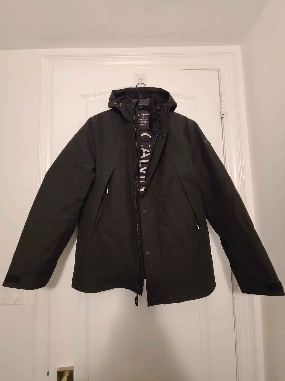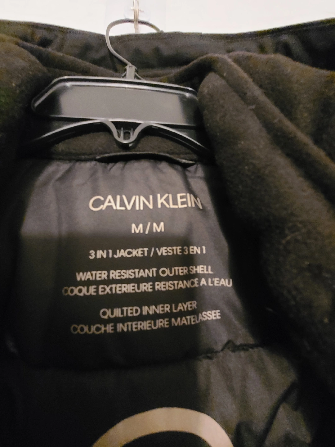 Selling a Calvin Klein 3-in-1 jacket in size M. It's a water-resistant outer shell with a quilted inner layer. Perfect for staying dry and warm!