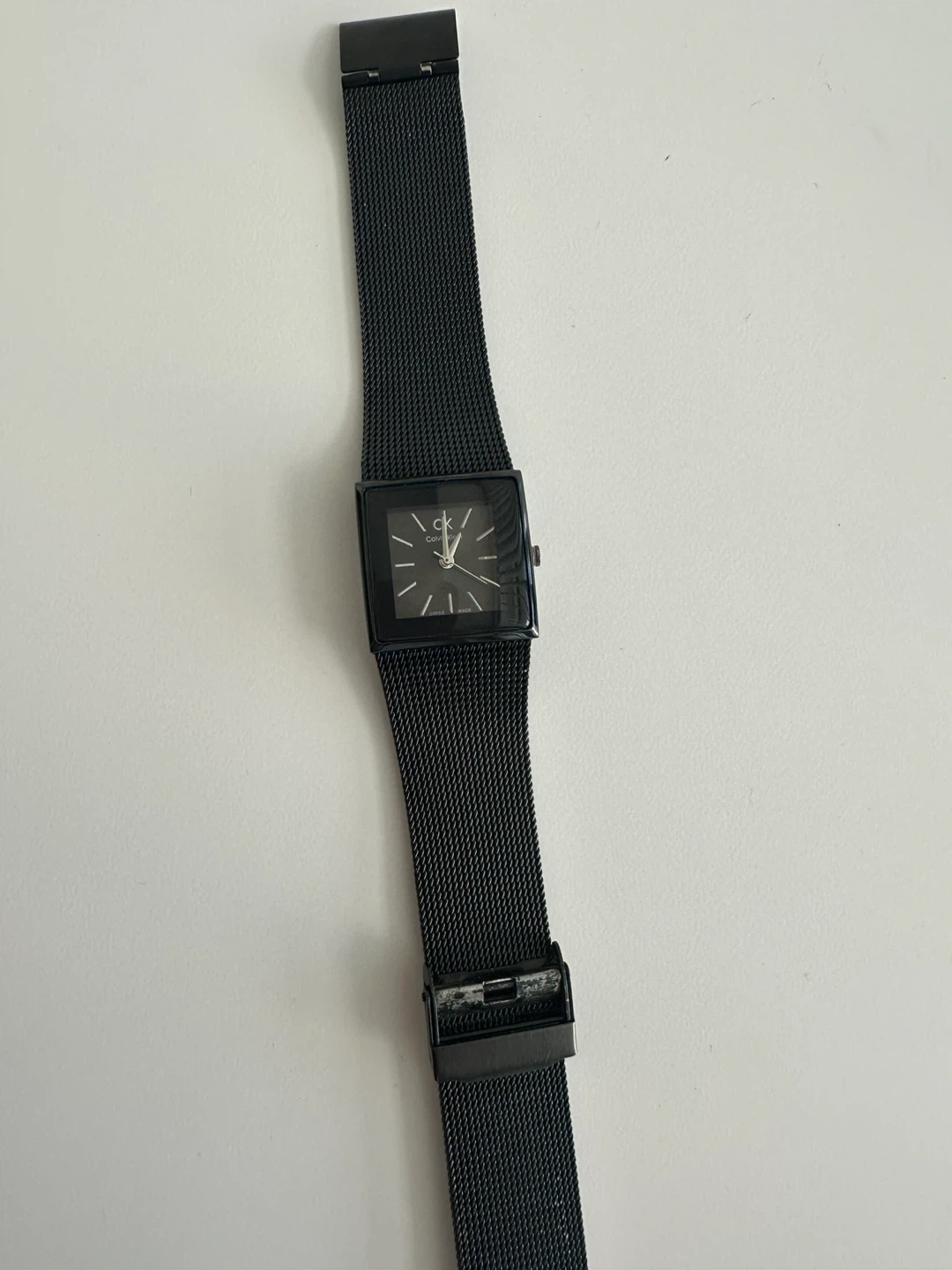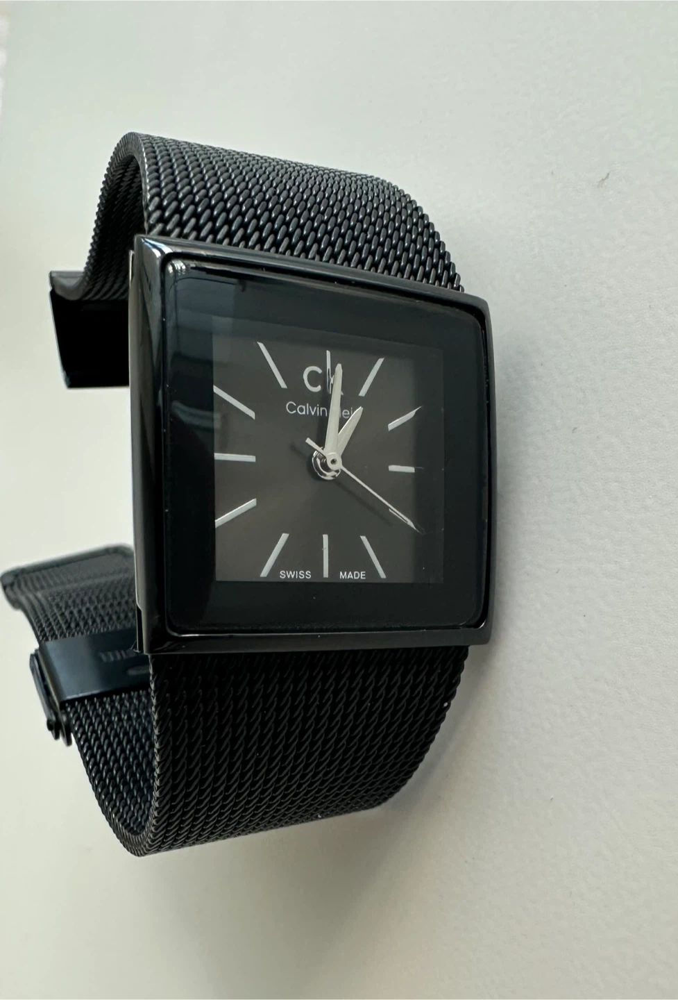 Selling a Calvin Klein watch with a black mesh band. It's in great condition and has a sleek, modern look. Perfect for everyday wear or a night out