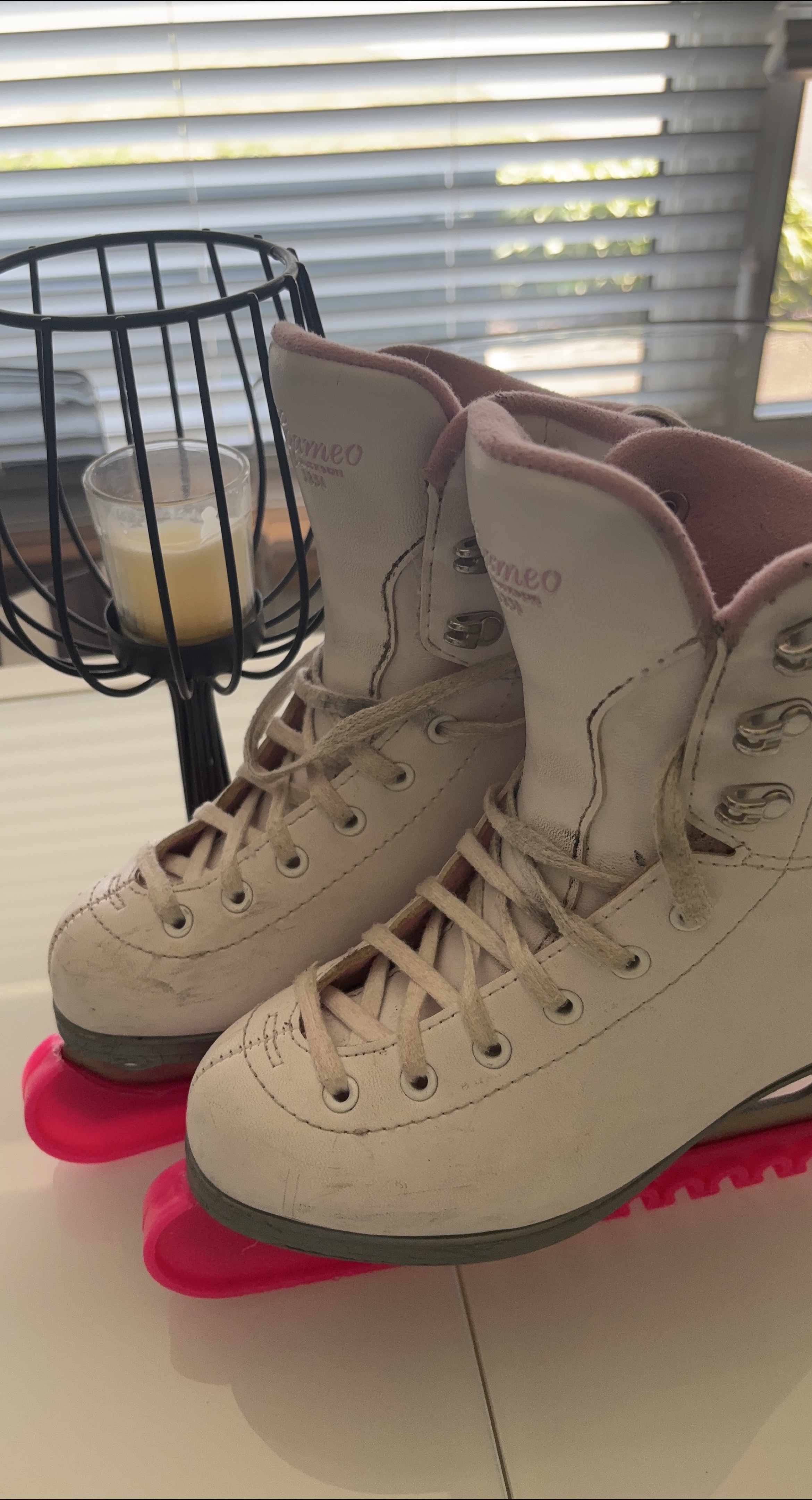 Selling a pair of Cameo ice skates in size 3. They are white with pink accents. Perfect for beginners or recreational skating! Needs sharpening Pink Skate Guards INCLUDED