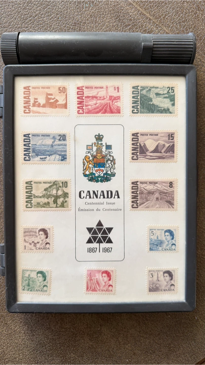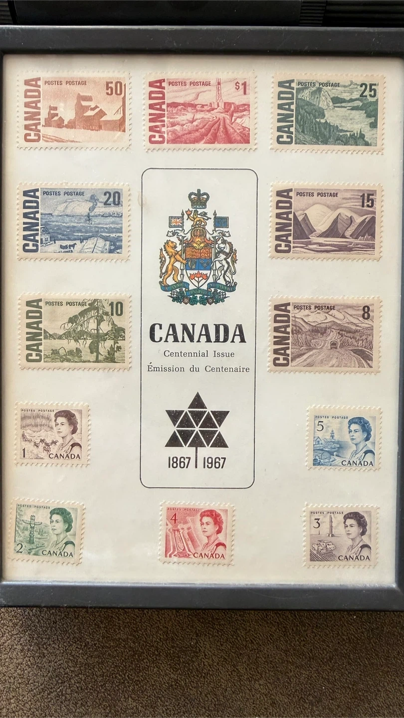 Vintage Canada Centennial Issue stamps from 1867-1967, nicely displayed in a frame. A great piece for any stamp collector or Canadian history enthusiast!