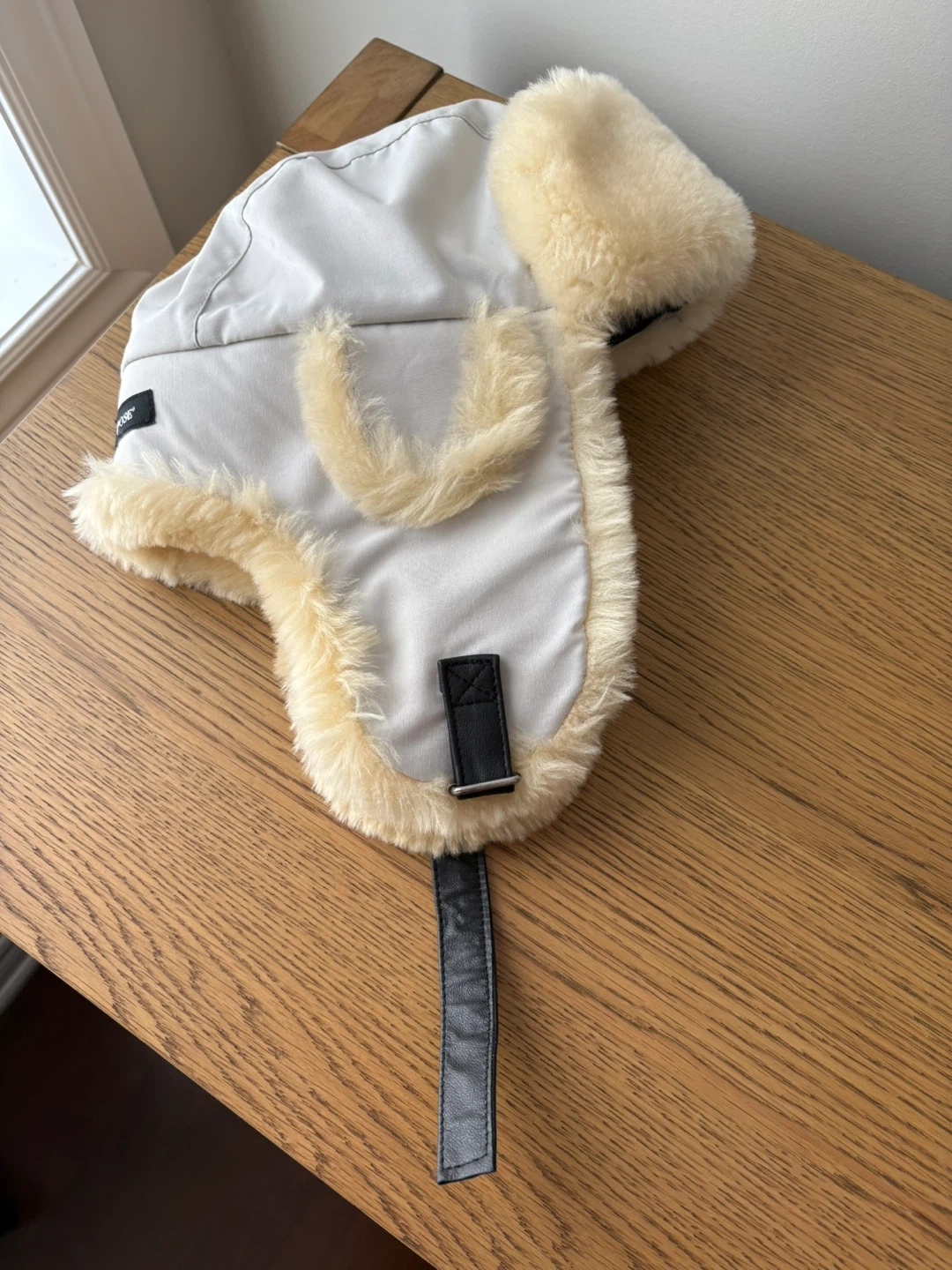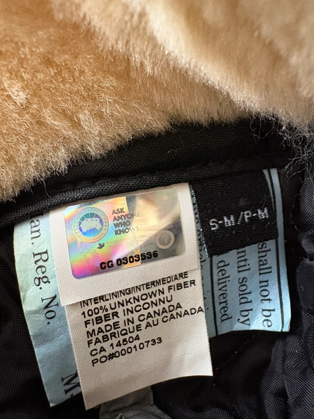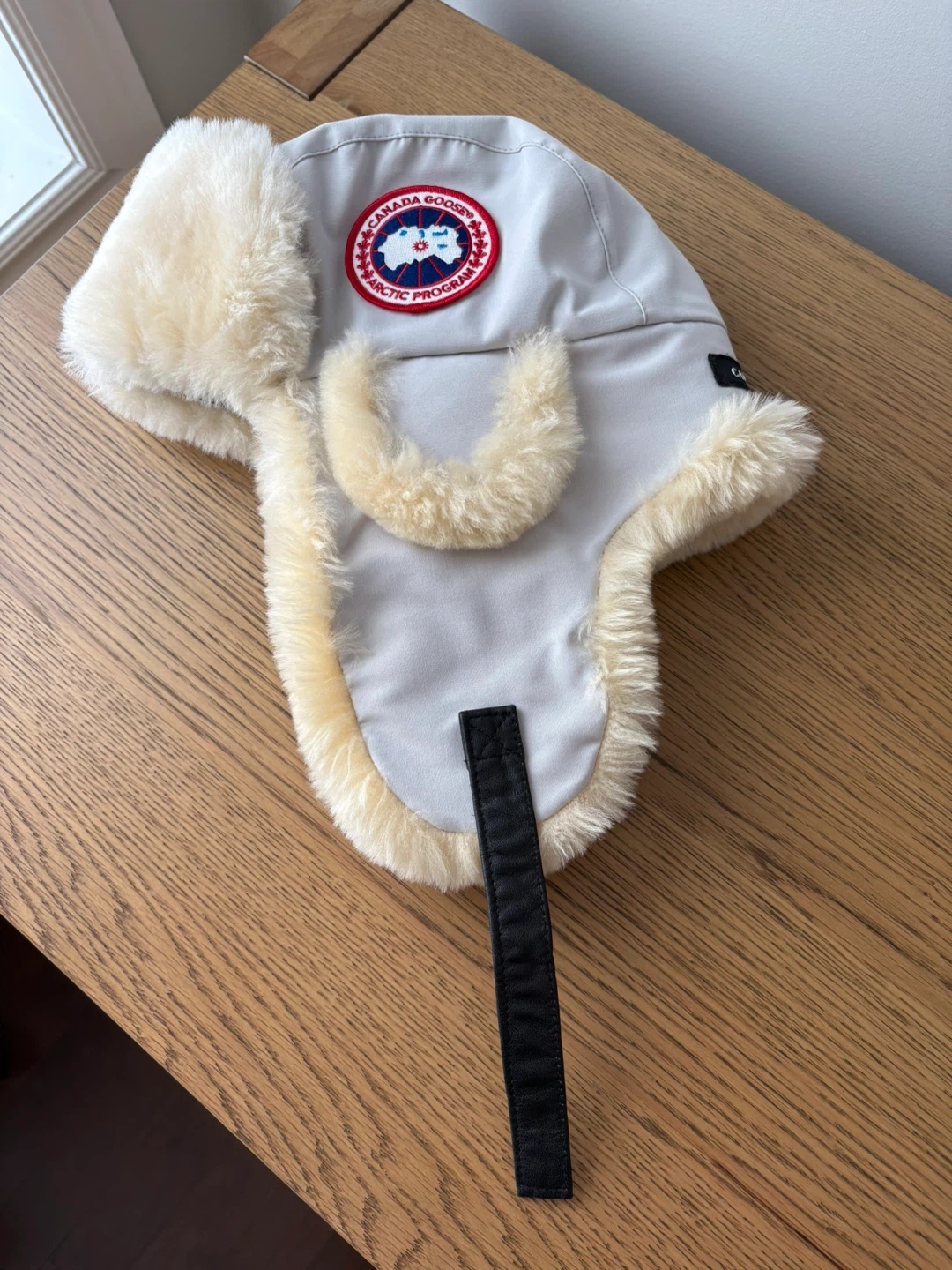Cozy Canada Goose Aviator Hat in size S-M. This hat is made in Canada and features an interlining of unknown fiber. Perfect for keeping warm in the winter! Toddler Hat