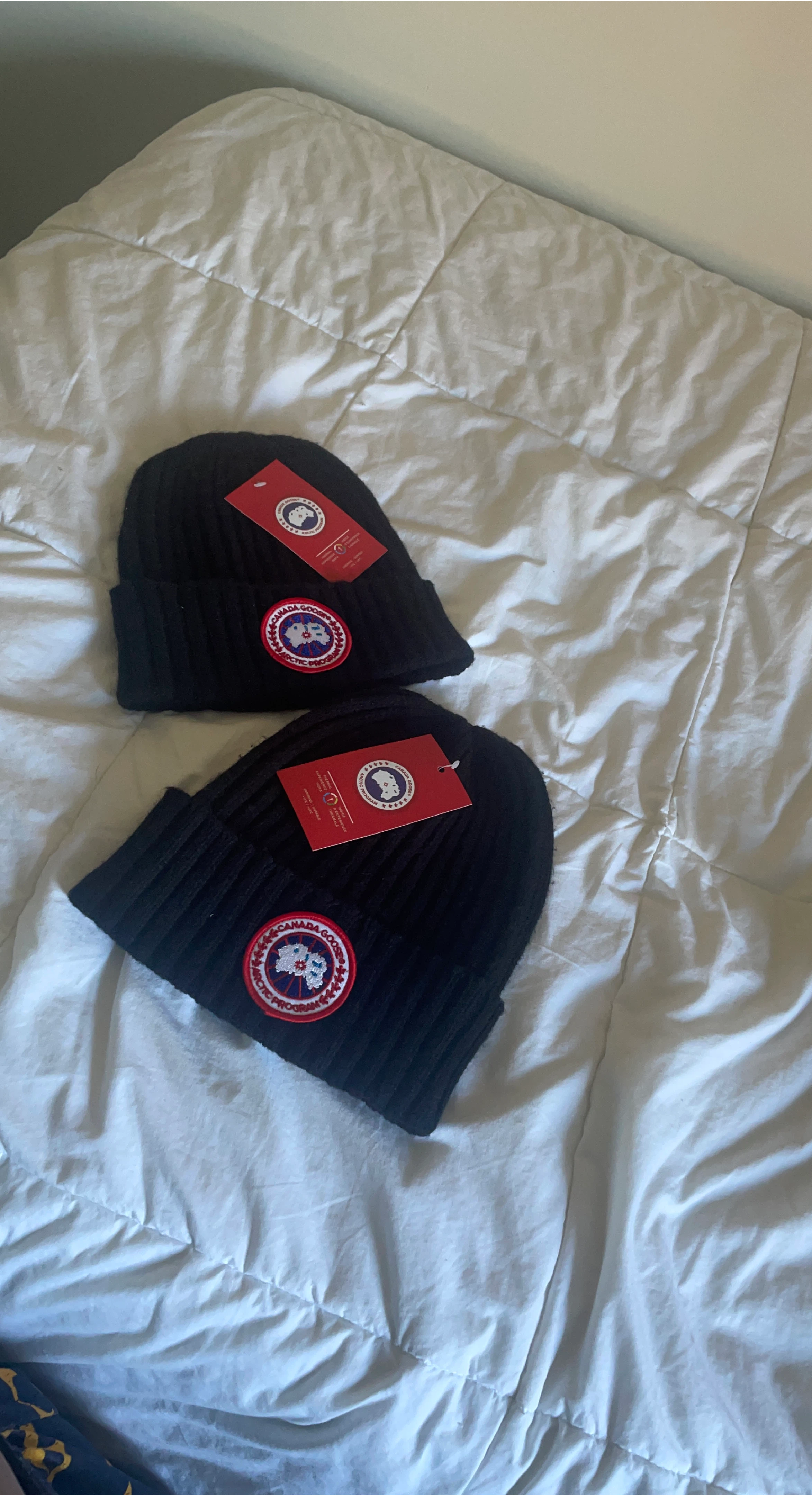 Selling a couple of Canada Goose toques in black Both for 100 Or 75 each Birthday gift that I don’t want