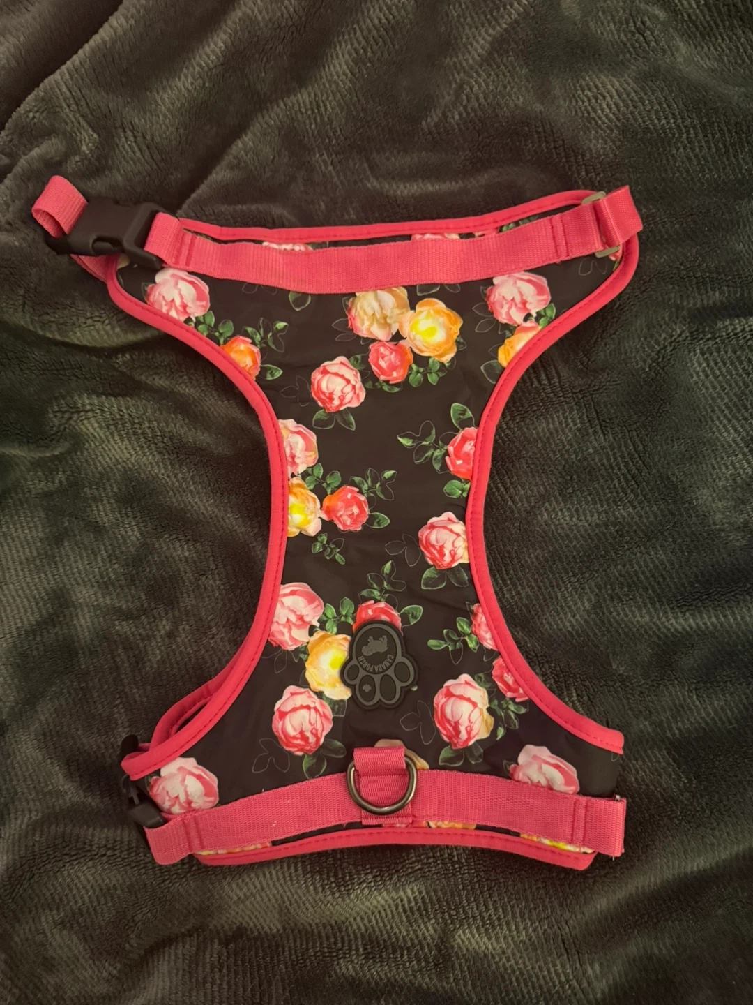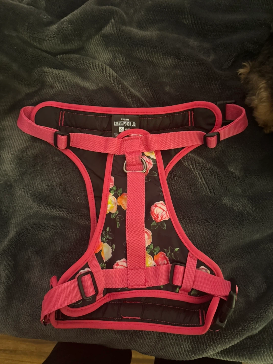 This is a super cute floral dog harness from Canada Pooch! It's a size XL and features a lovely floral pattern. Perfect for your furry friend's walks! Used one time