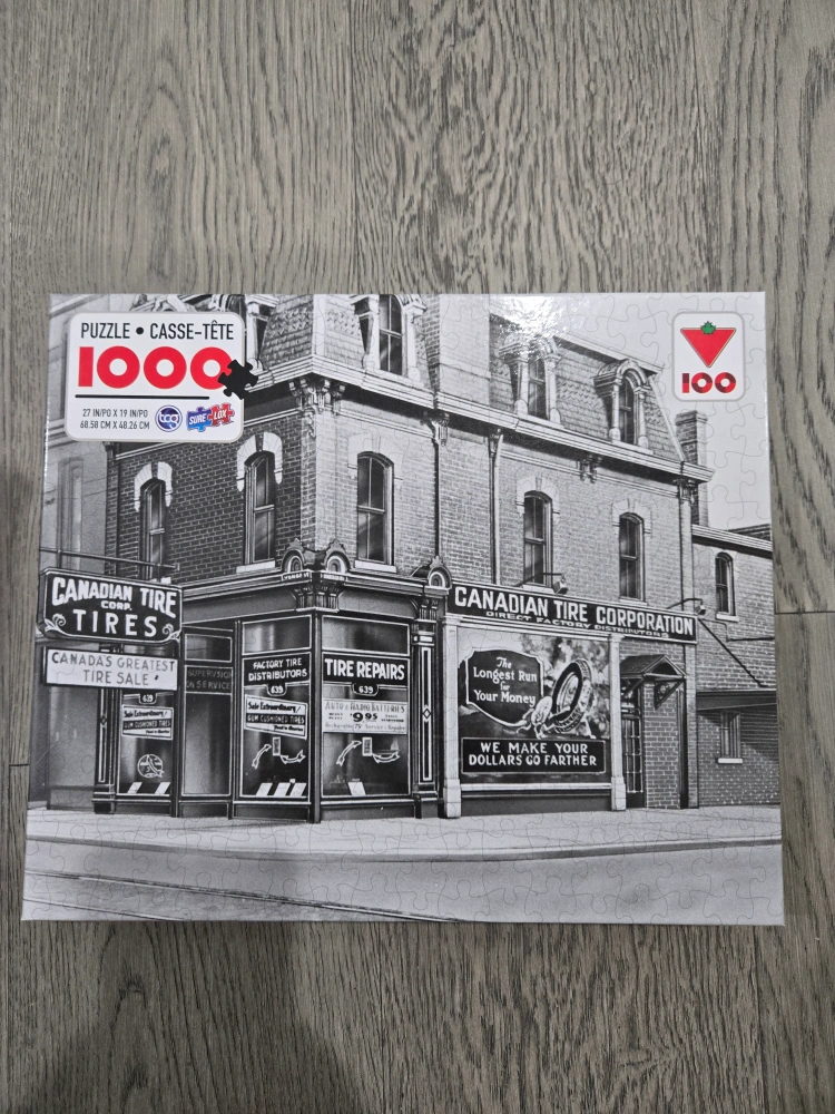 Selling a Canadian Tire 100th Anniversary commemorative puzzle! It's a 1000-piece puzzle with images inspired by our quintessentially Canadian heritage. The assembled puzzle measures 27 in x 19 in / 68.58 cm x 48.26 cm
