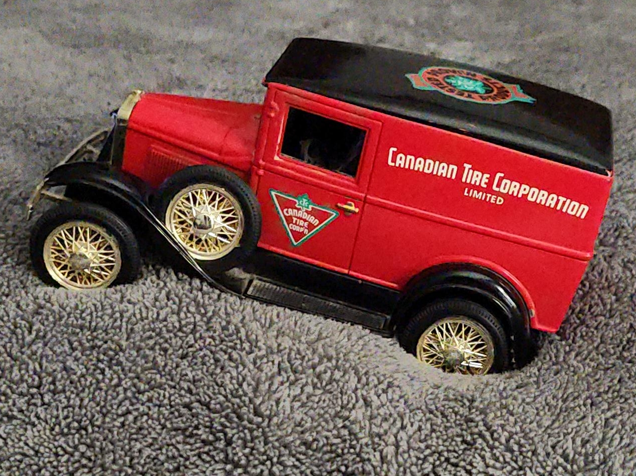 Selling a Canadian Tire Corporation Limited diecast delivery truck. It's red and black with gold wheels. Great for collectors! I s also a piggy bank