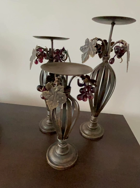 Selling a set of three decorative candle holders. They feature a unique design with metal leaves and grape accents. Perfect for adding a touch of elegance to any room!