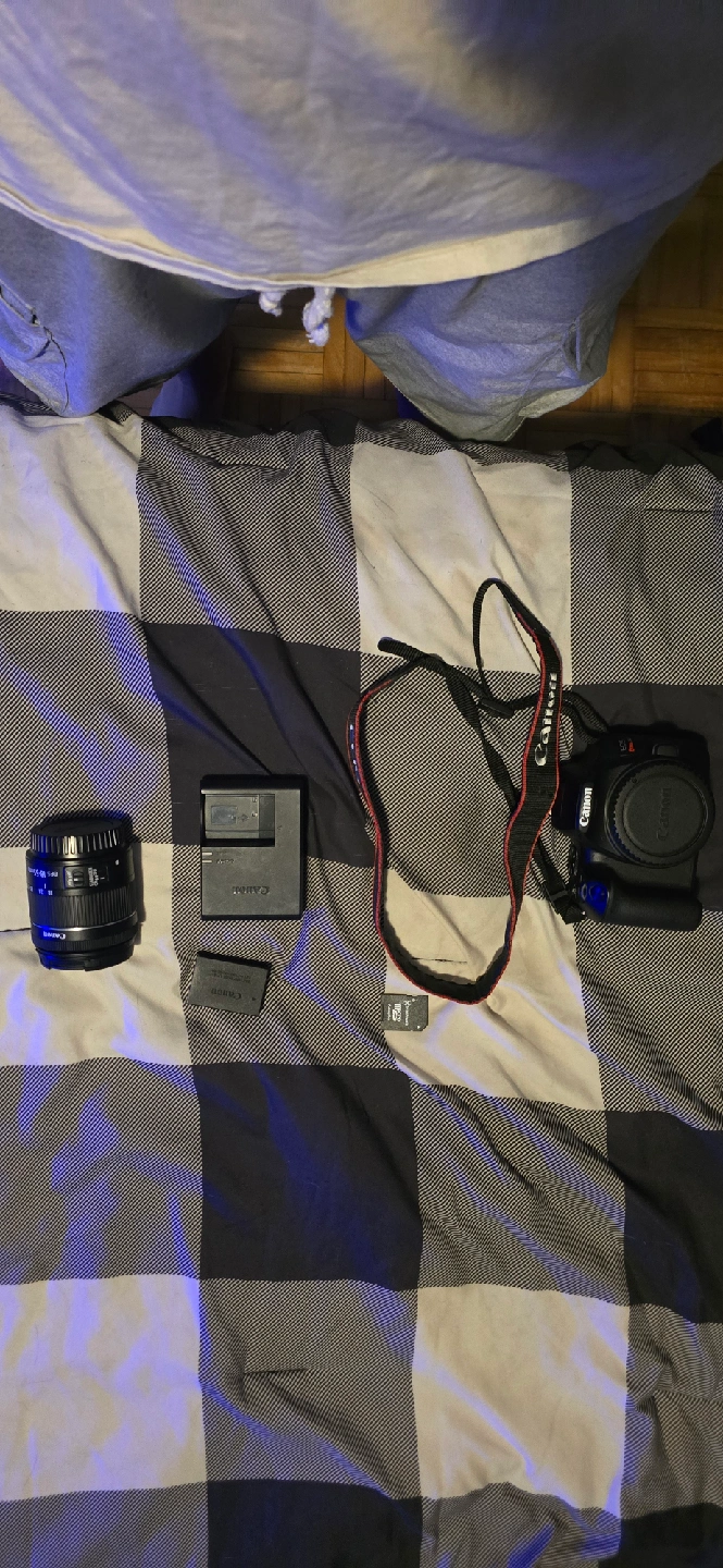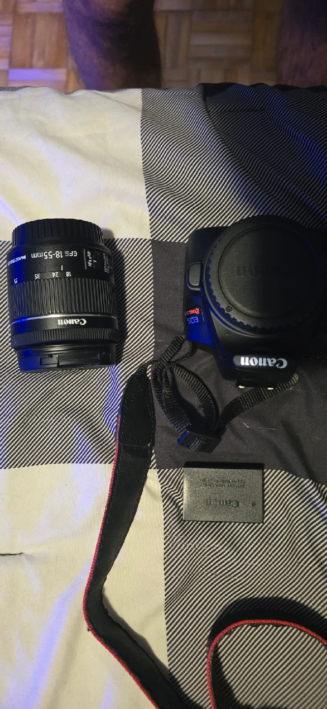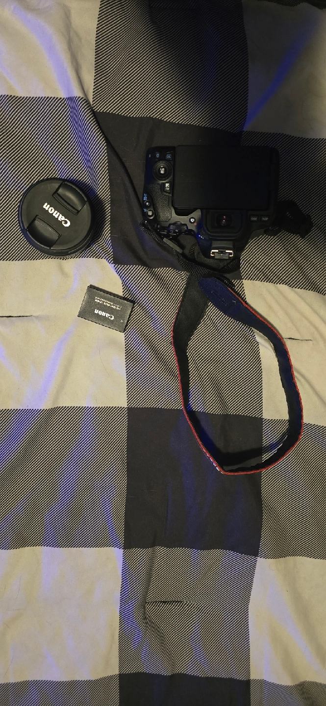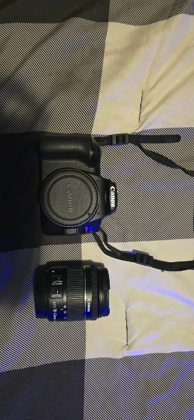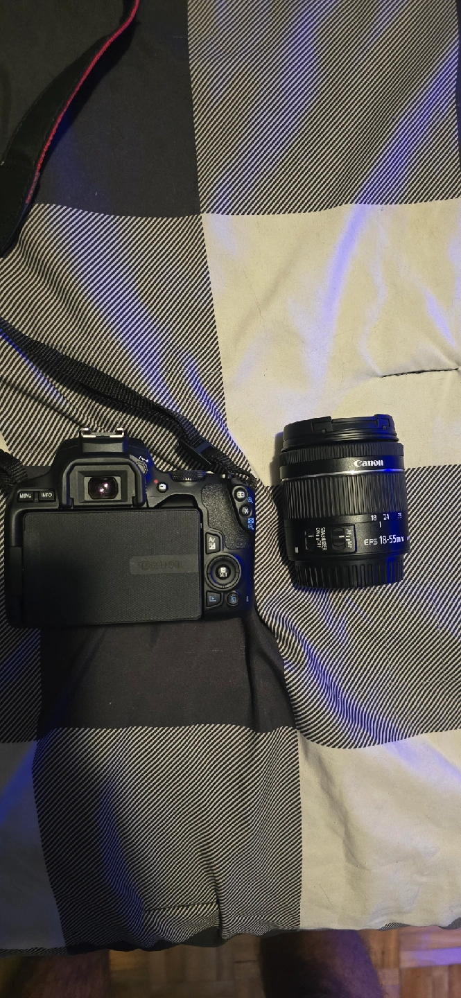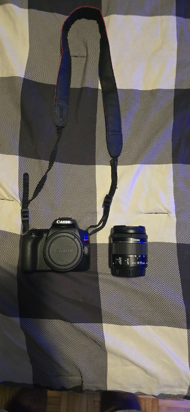 Selling a Canon EOS Rebel SL3 DSLR camera. It comes with an 18-55mm lens, perfect for getting started with photography! Also included are a camera strap, battery, and a Blackweb 128GB Micro SD card with adapter to store all your photos and videos