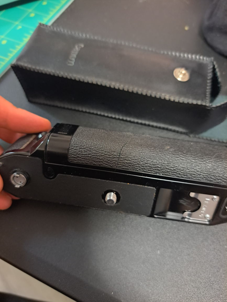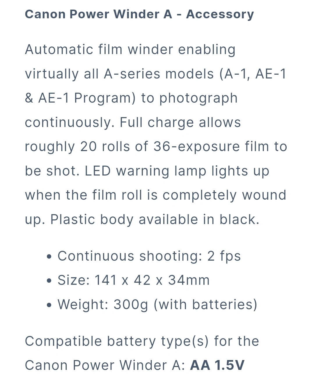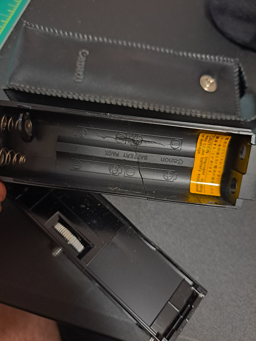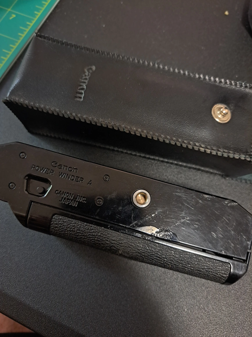 Power winder for use with Canon A-1, AE-1, AE-1 Program, AT-1, and AV-1 35mm film SLR cameras Battery cover is cracked but holds in place. uses 4x AA batteries