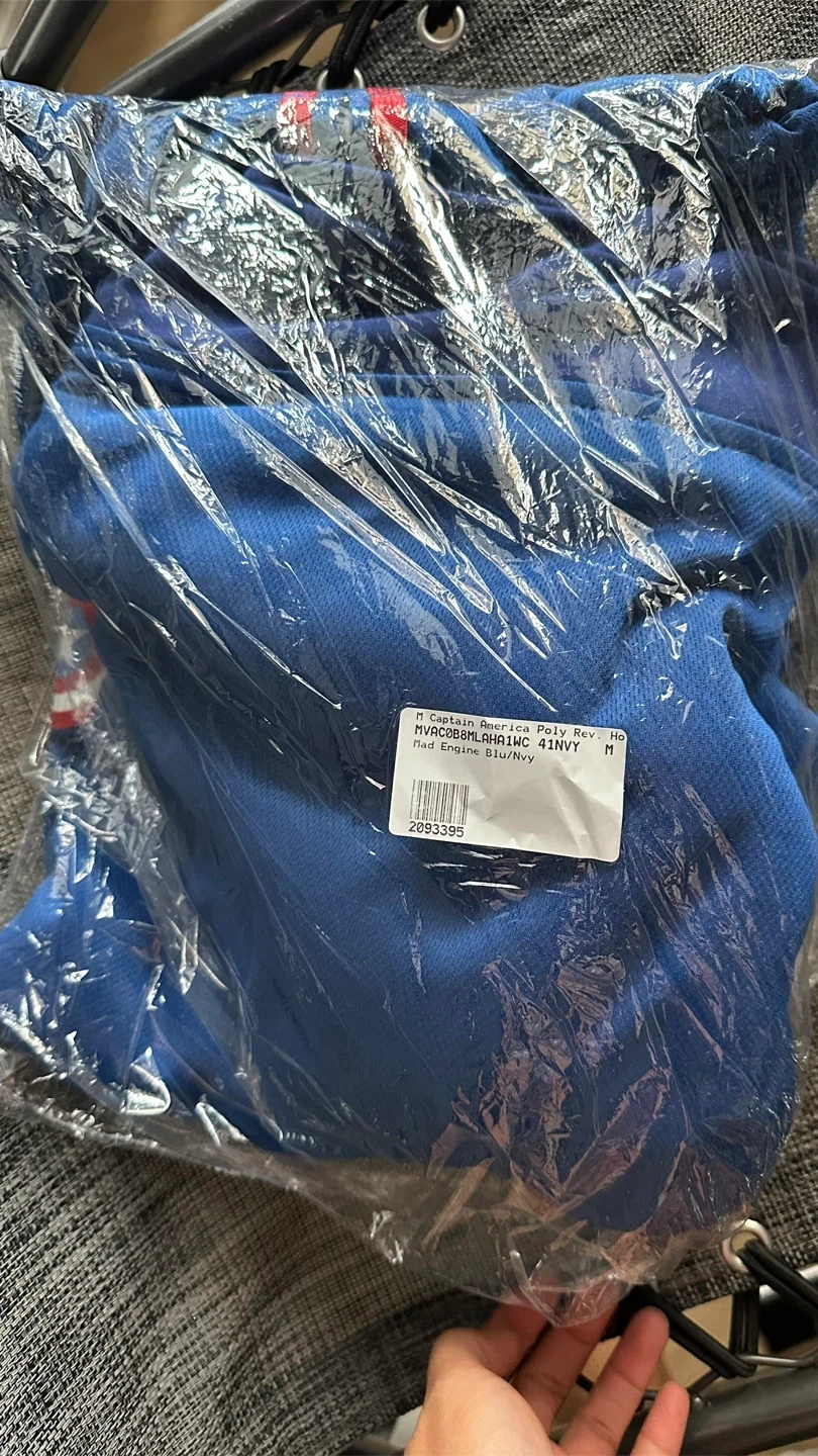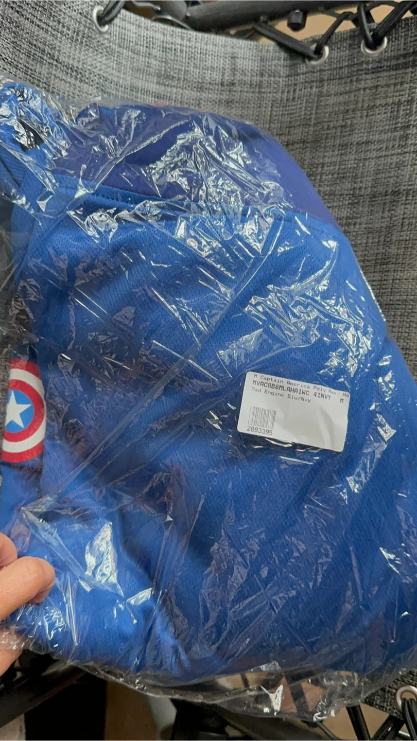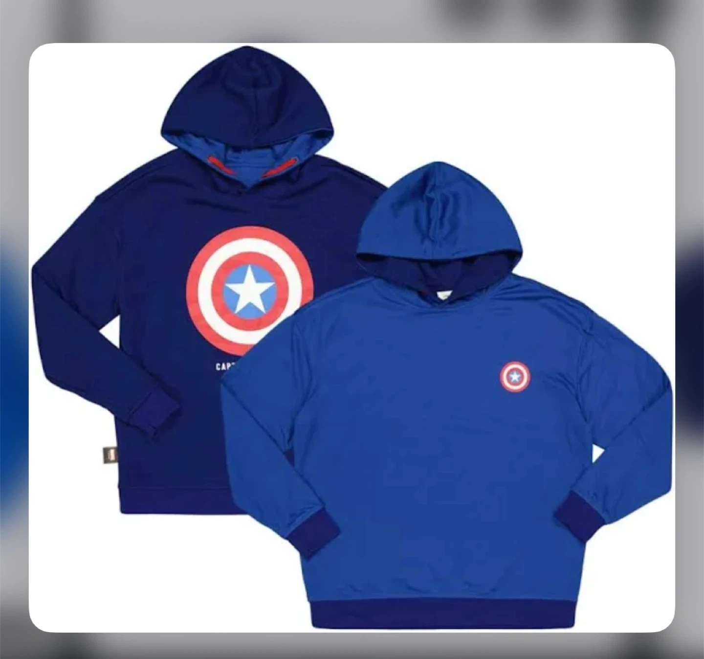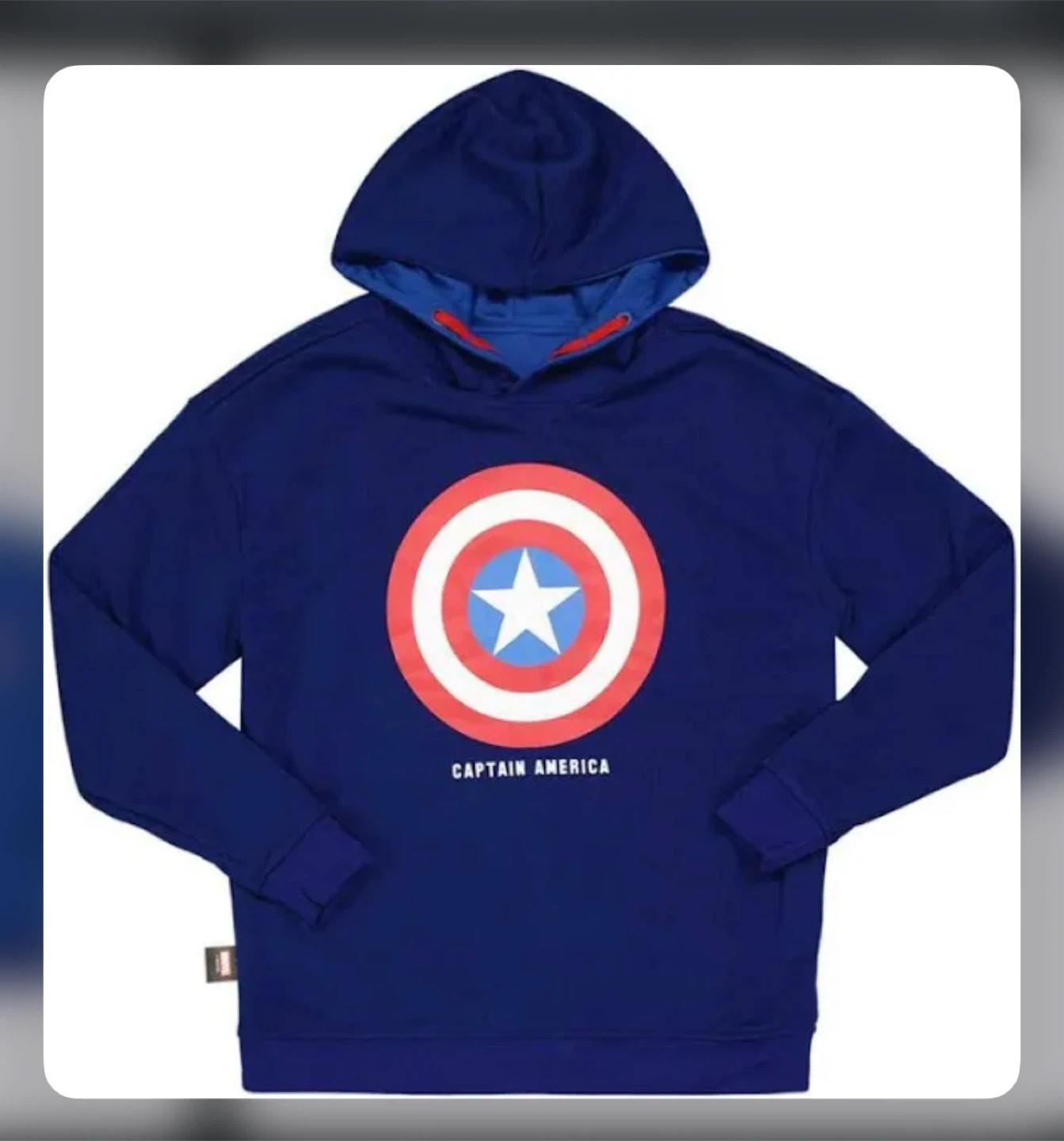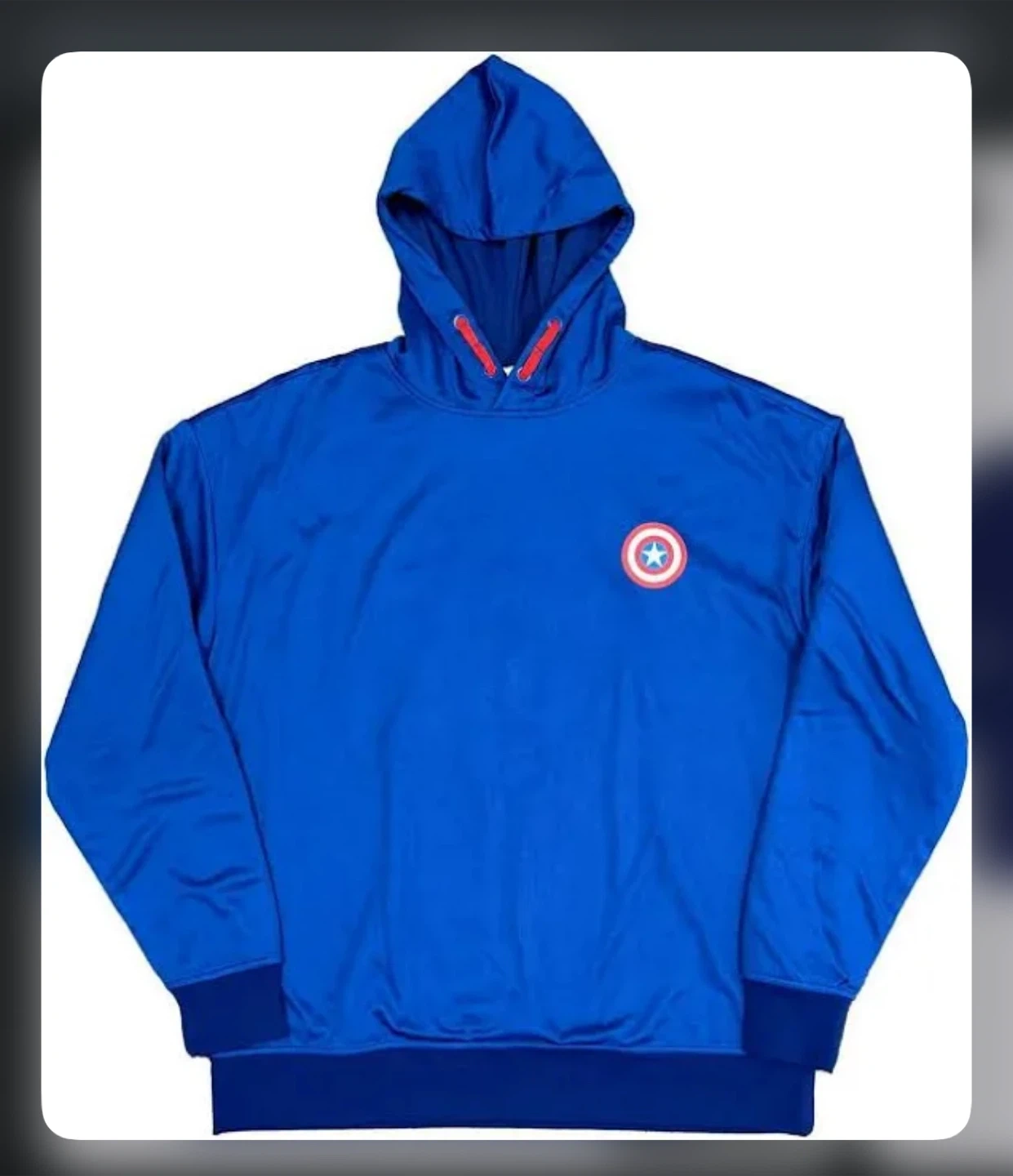 Here's a Captain America hoodie in blue, size medium! It's in great condition and features the iconic Captain America logo. Perfect for any Marvel fan!