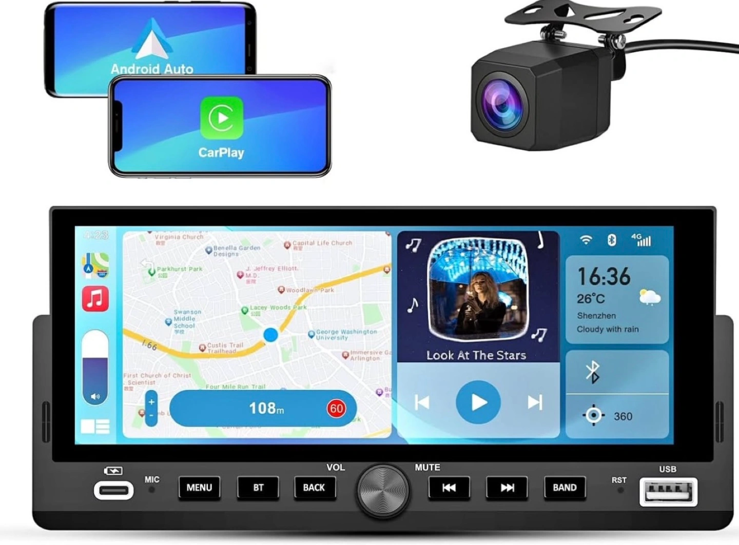 Selling a car stereo compatible with both Android Auto and Apple CarPlay. It also comes with a rear-view camera for easier parking and navigation. The unit features a large display for maps, music, and other apps, making your driving experience safer and more enjoyable!