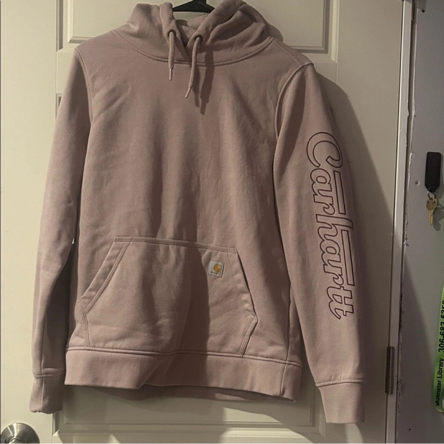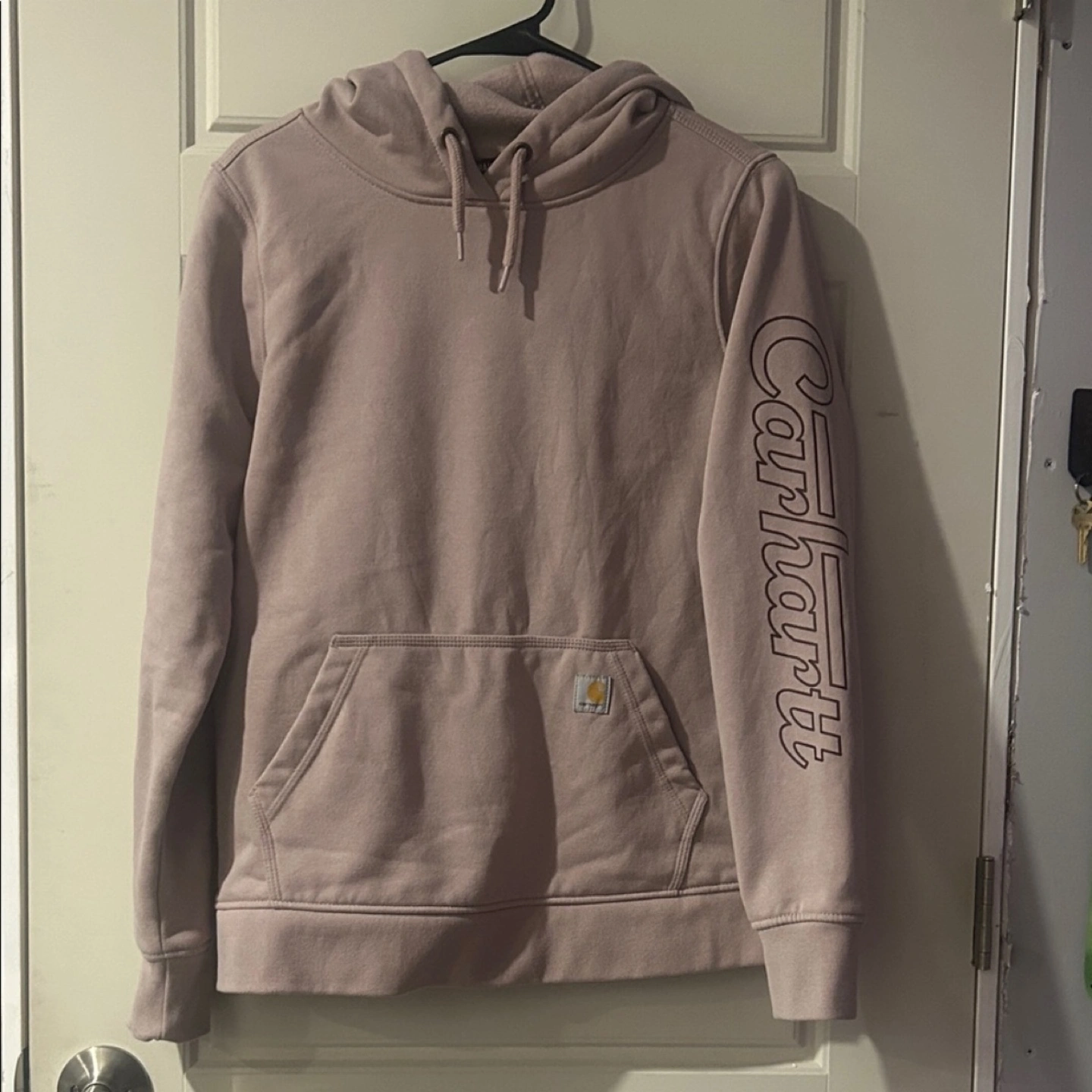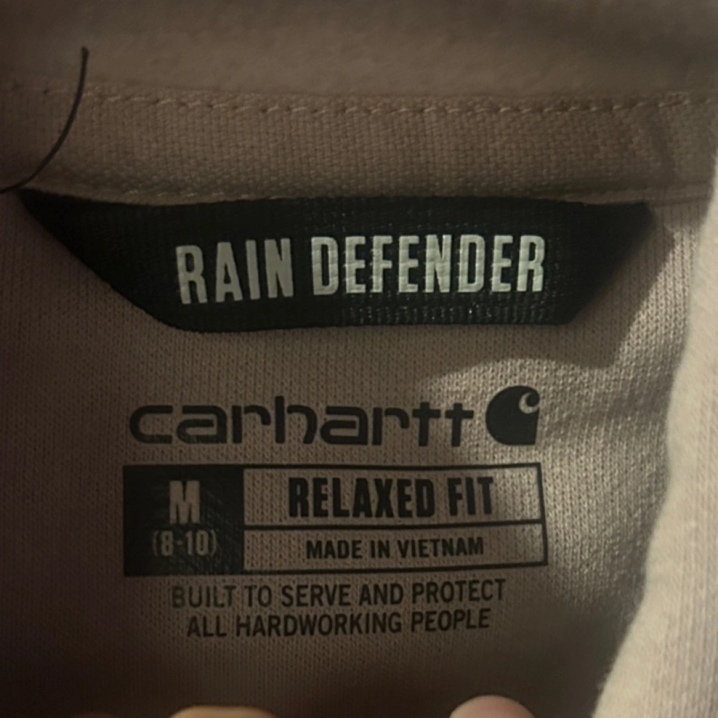 Selling a Carhartt Rain Defender hoodie in size medium. It's a relaxed fit and features the Carhartt logo on the sleeve. The material is designed to protect against rain, making it a practical choice for everyday wear