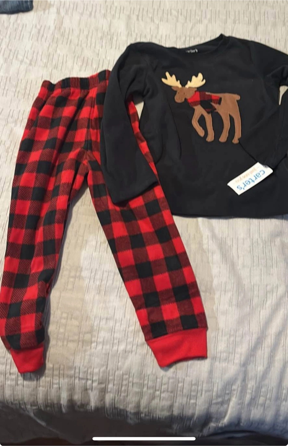 Super cute Carter's pajama set! The top is black with a moose wearing a scarf, and the bottoms are a classic red and black plaid. Perfect for cozy nights!