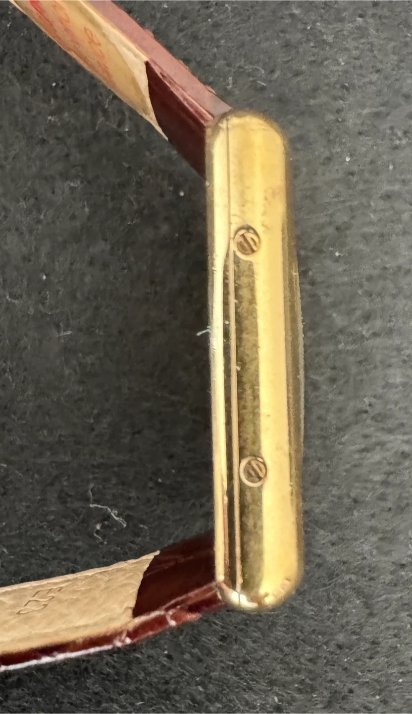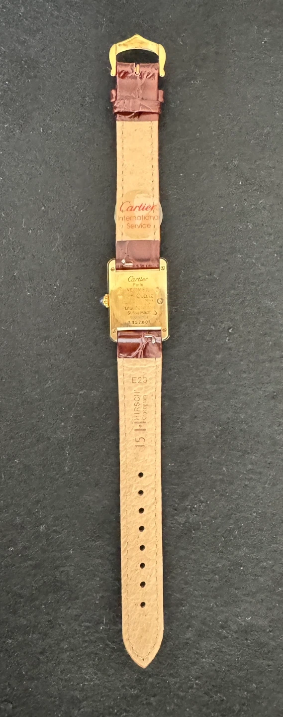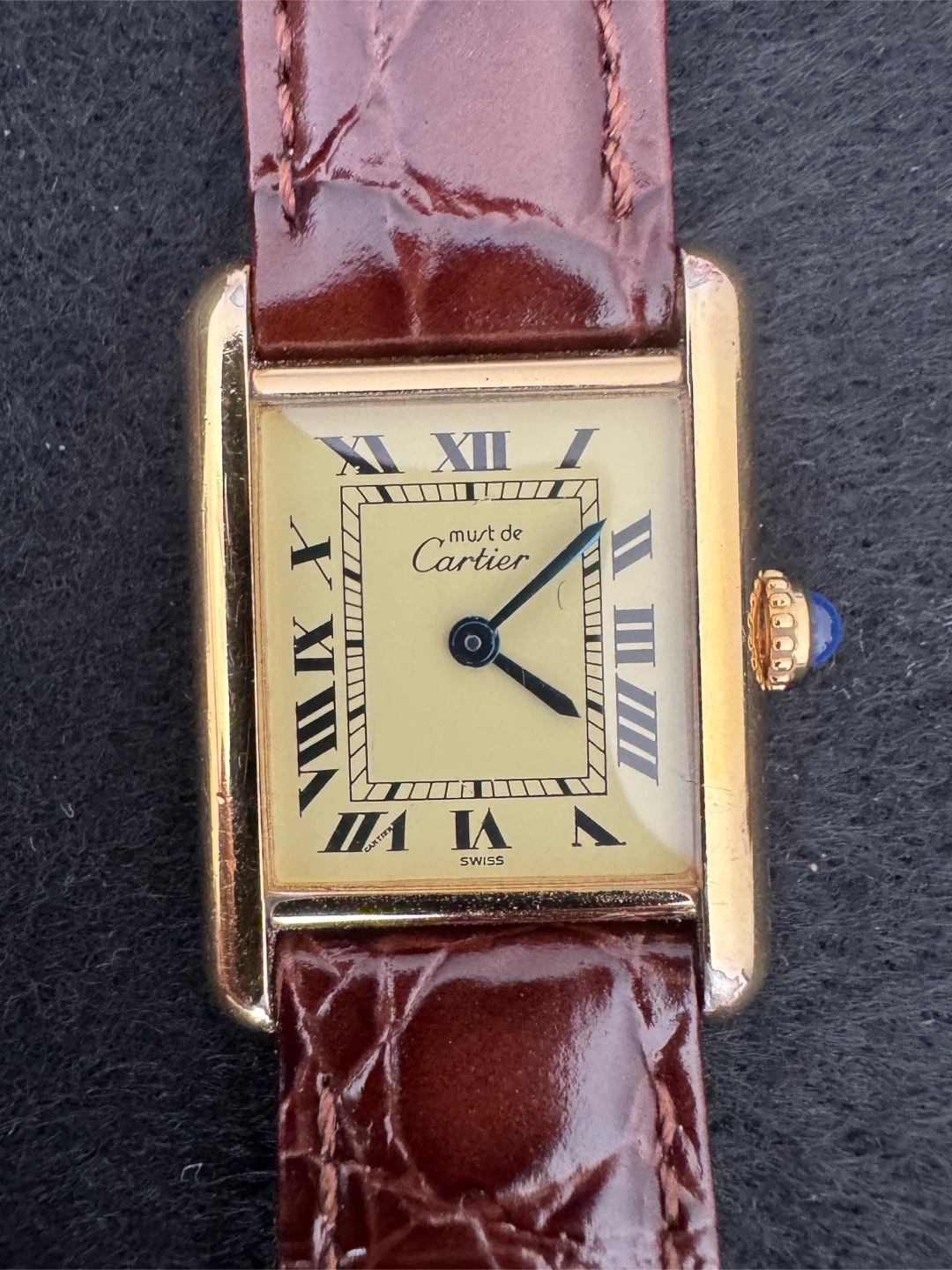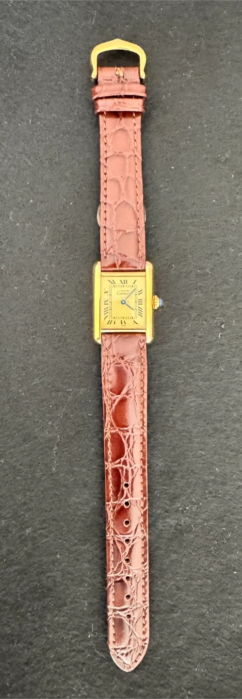 Selling a Cartier Must de Tank Quartz Vermeil watch! It features a gold-plated silver case and a brown leather strap. The watch has a classic and elegant design, perfect for any occasion! It's in great condition and ready to wear