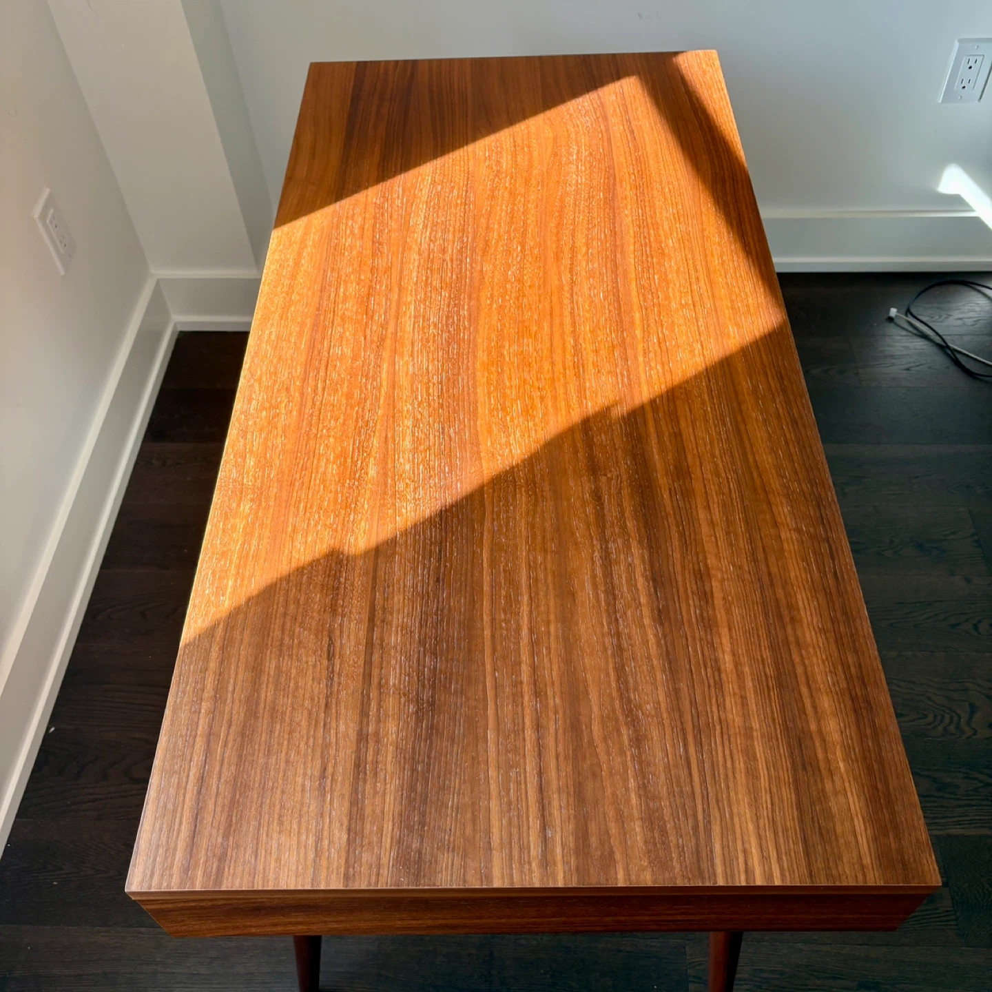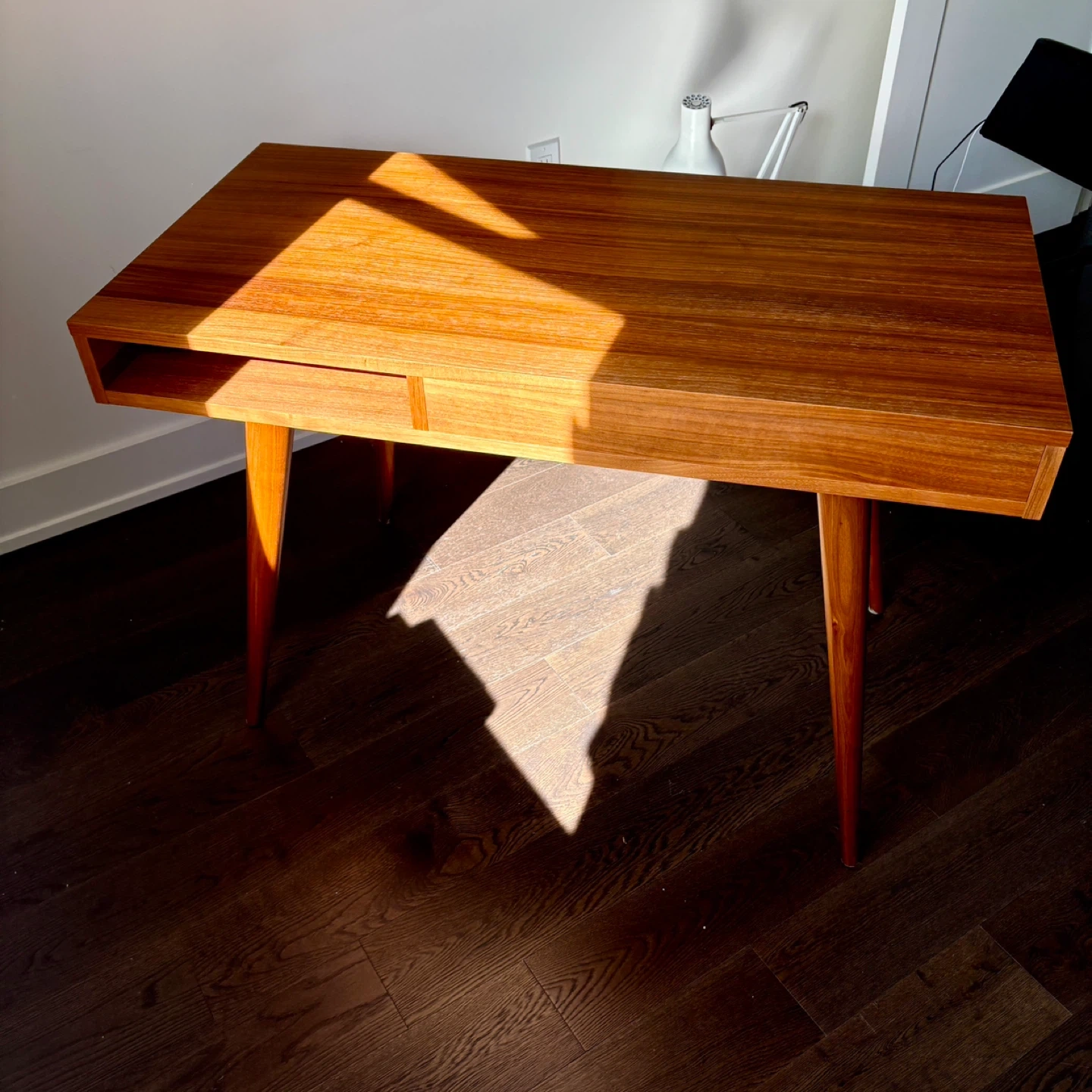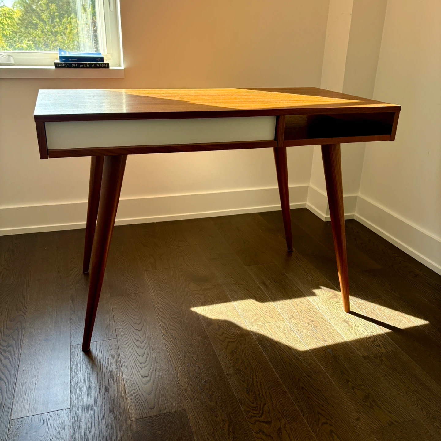 [Moving sale] The perfect desk in Walnut. Purchased from Design Within Reach 3 years ago. Nothing wrong with it! Incredibly sturdy & well made. On DWR currently for $2,150, marked down from $2,700 +HST Height (in): 29⅝ Width (in): 43⅜ Depth (in): 21¾ Weight (lbs): 53 The legs do turn off for easy travel. Pick-up only. St. Clair & Oakwood area. From DWR: The simple forms of midcentury architecture inspired designer Nazanin Kamali's Celine Desk (2008), which is crafted with turned and tapered solid hardwood legs, a single-drawer desktop and an open cubby for documents and other essentials. As the founder of two start-ups, Kamali has worked on everything from restaurant design to art installations. With such an impressive resume, it's not surprising that her work has been recognized with a Good Design Award and two Design Plus awards. Made in Lithuania. Streamlined desk sized for spaces big or small. One drawer and an open cubby. Turned and tapered solid wood legs.