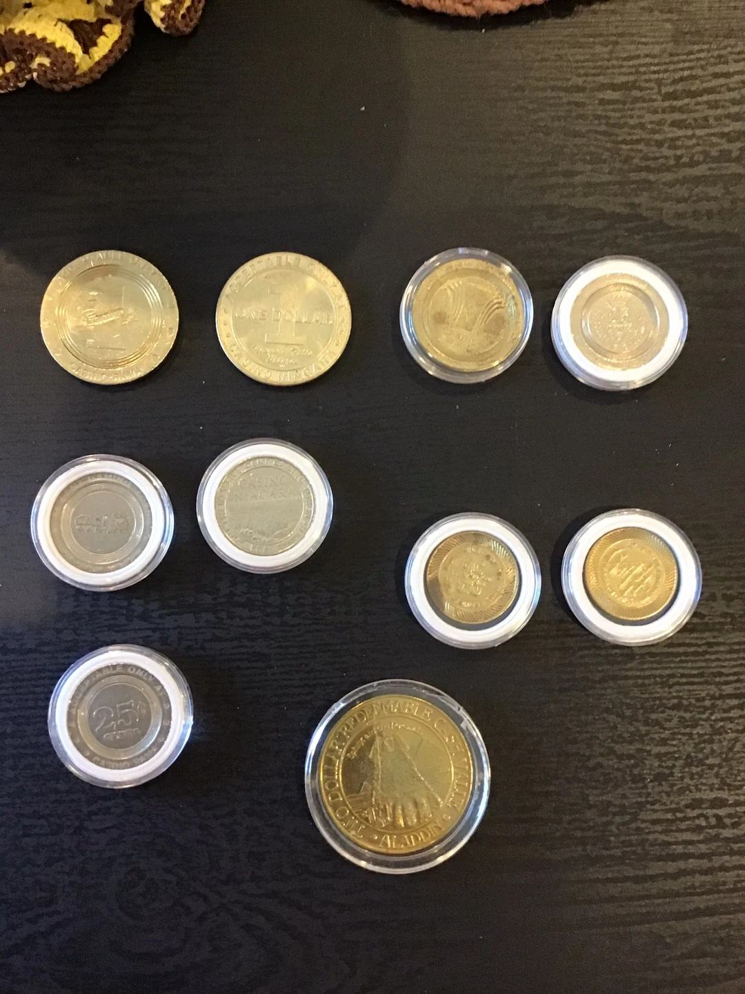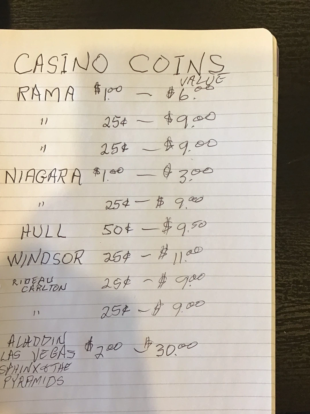 Selling a collection of casino coins from various locations including Rama, Niagara, Hull, Windsor, and Aladdin in Las Vegas! The values are marked in the notebook.