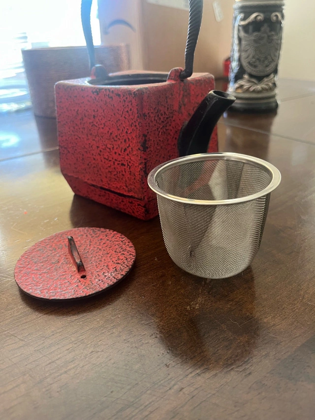 Enhance your tea experience with this charming red cast iron teapot, perfect for brewing your favourite loose leaf teas. This teapot has a capacity of approximately 20 ounces and comes complete with a stainless steel mesh infuser for easy steeping. It's in good condition and ready to be a delightful addition to your kitchen. * Material: Cast iron * Colour: Red * Capacity: Approximately 20 ounces * Includes: Stainless steel mesh infuser If the ad is still up, it's still available!