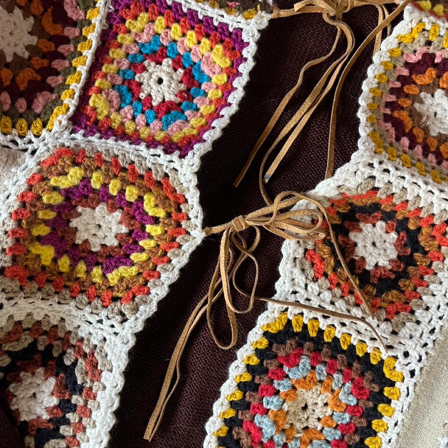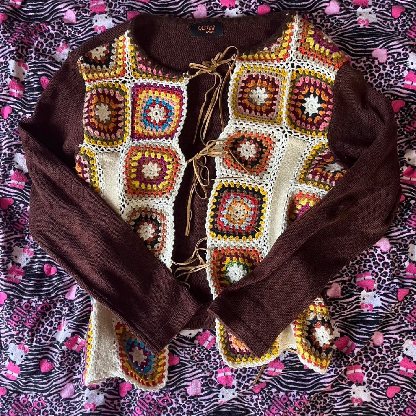 Selling a Castor Tricot cardigan with a unique crochet design! The cardigan features colourful crochet squares and brown accents. It's a really eye-catching piece!