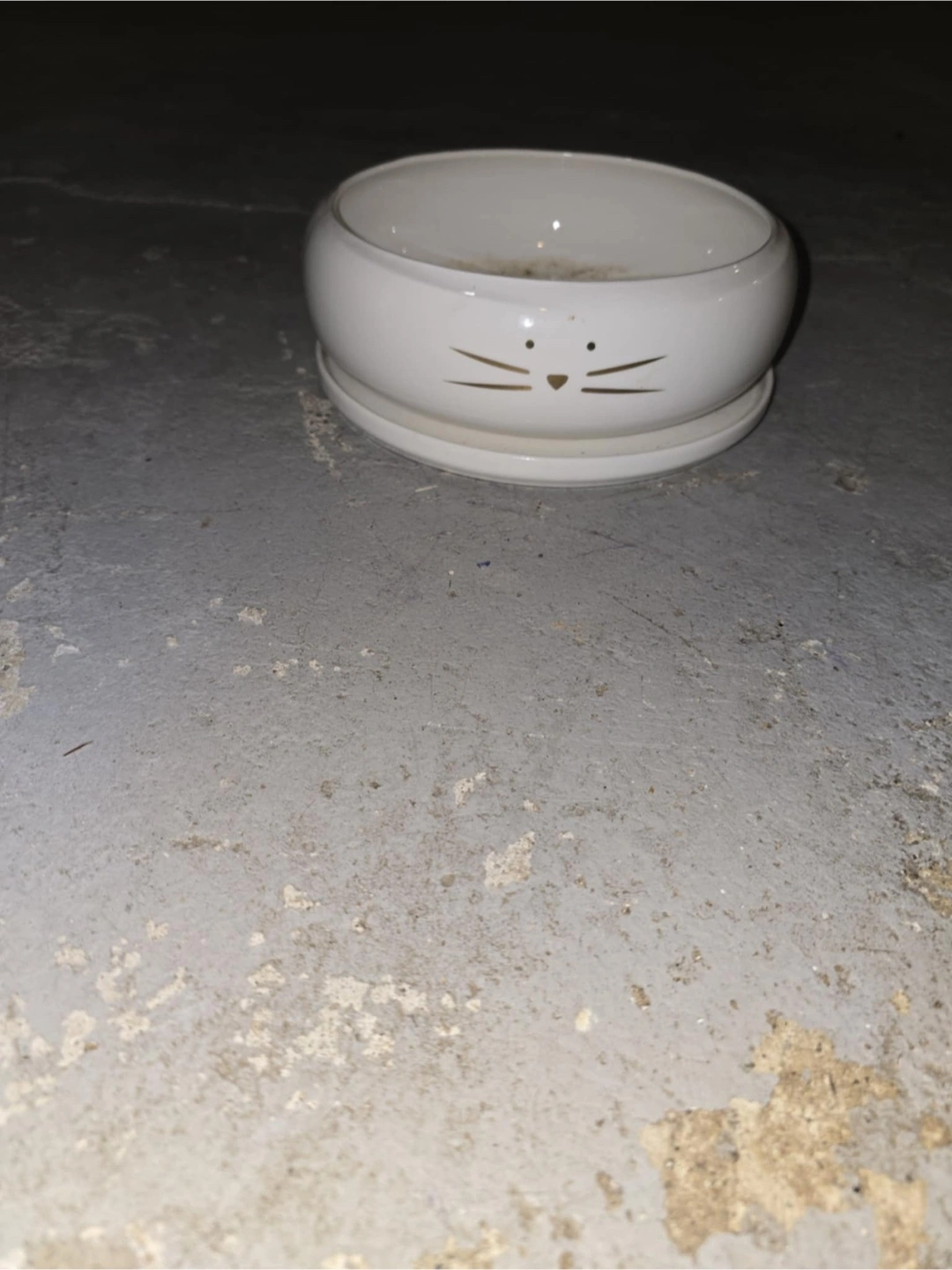 Selling a cute white ceramic pet bowl with a simple cat face design. It's perfect for small pets! Cat didn’t like it.