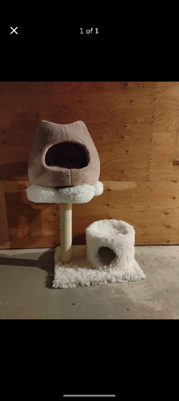 Selling a cat tree with a scratching post! It features a cozy little hideaway on top and a fun scratching post for your kitty to enjoy. There's also a little fluffy hideaway on the bottom, and a fluffy rug for your cat to lounge on. Both like new, the cat house was $30 before tax and the cat tree/scratcher was $110 before tax. both bought brand new, set up already from the store.