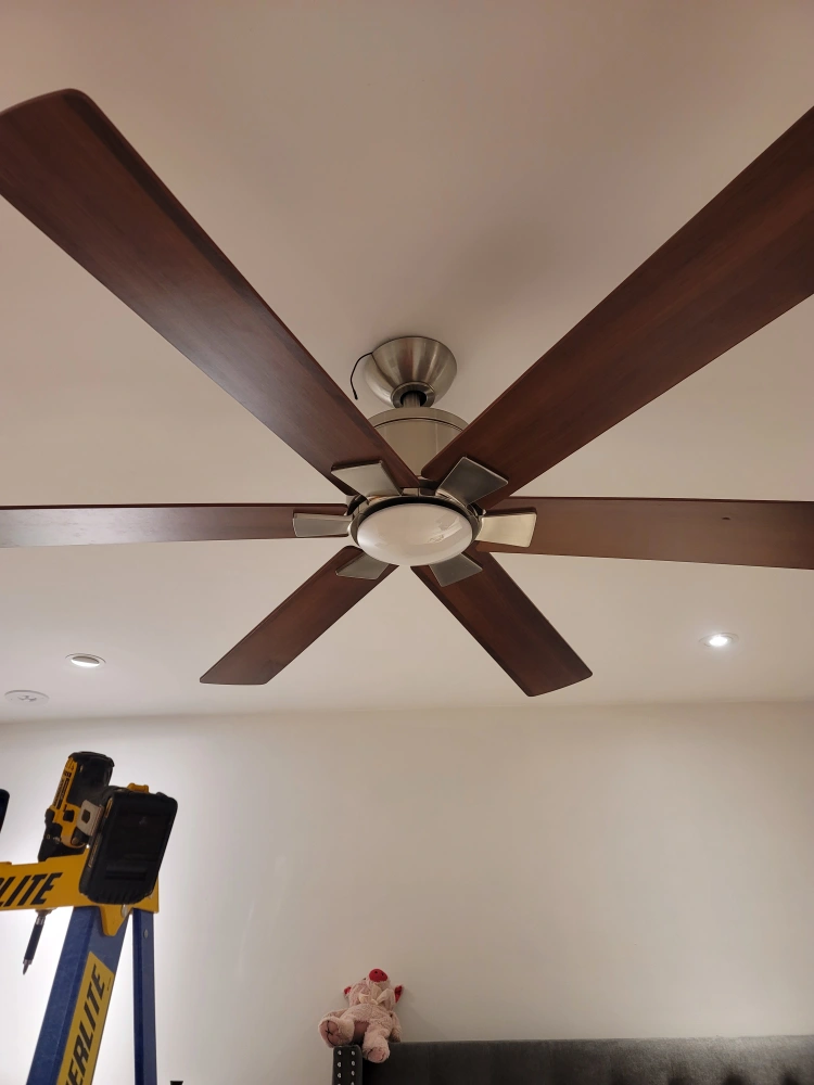 A ceiling fan with a modern design. It has multiple blades and a central led light fixture. Great for adding a stylish touch to any room
