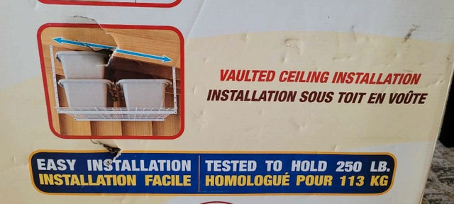 Brand new in box, holds up to 250 pounds. 45 inches x 45 inches, adjustable. Perfect for basement or garage. Strong and adjustable to hold large bulky seasonal items or storage bins. Get started on your home organization today! Cash pick up in Milton
