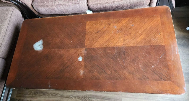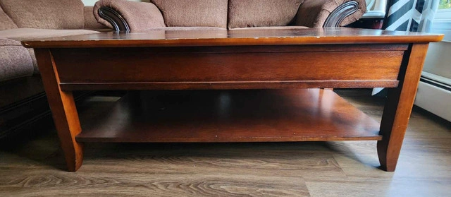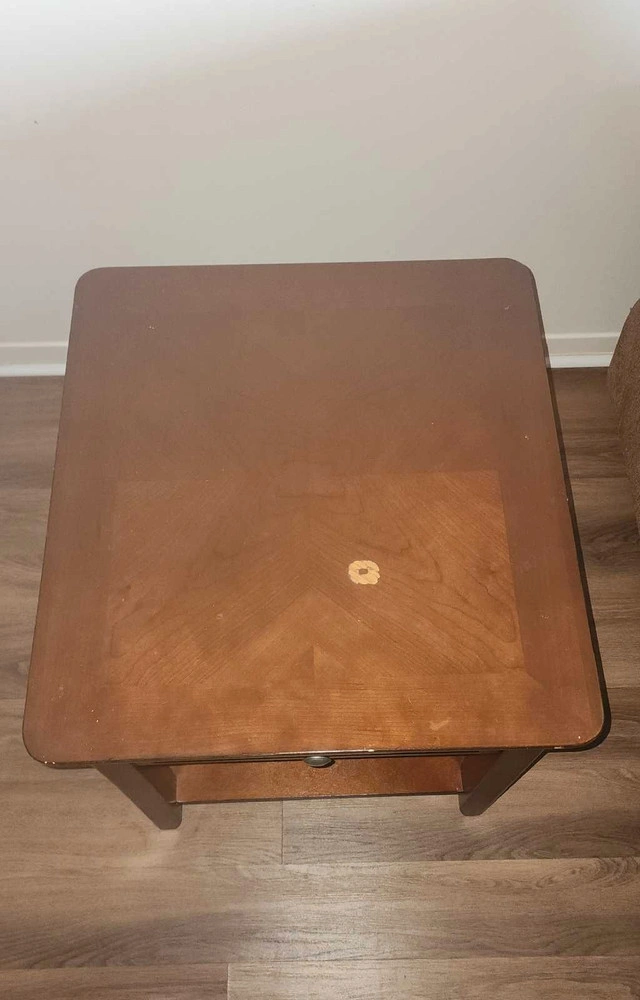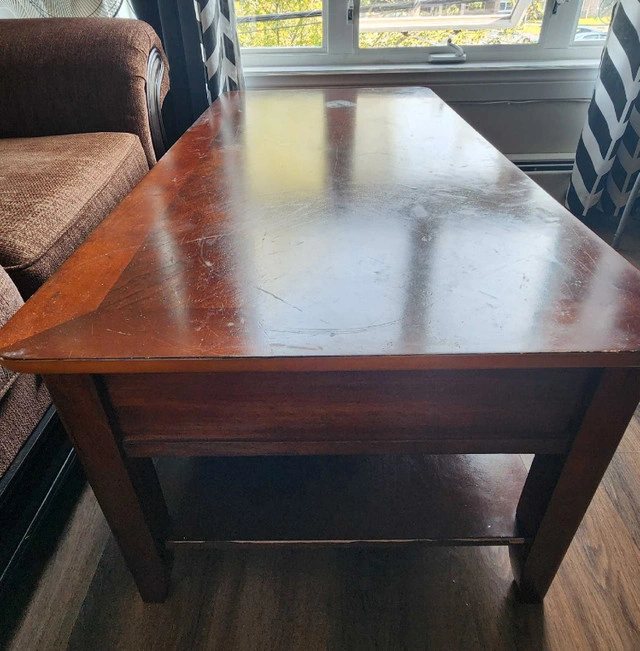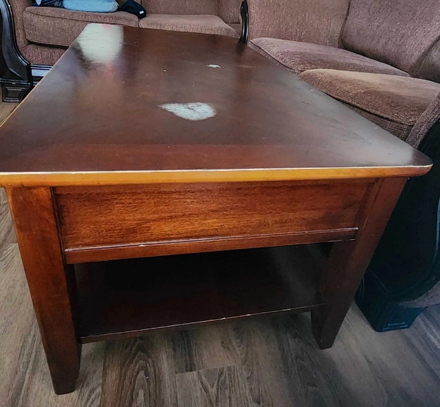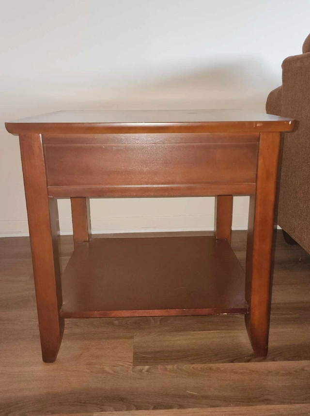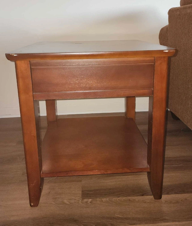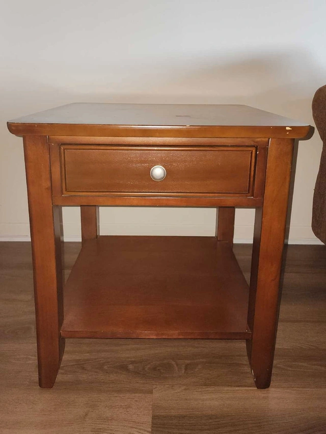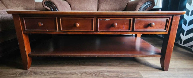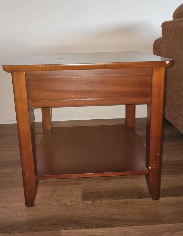 Solid wood Coffee Table 52x26x20 with 2 drawers and open shelf at the bottom. Side Table 24x26x25 with 1 drawer and open shelf at the bottom. Both pieces show signs of wear and tear, including visible heat damage on the tabletops. Pickup only